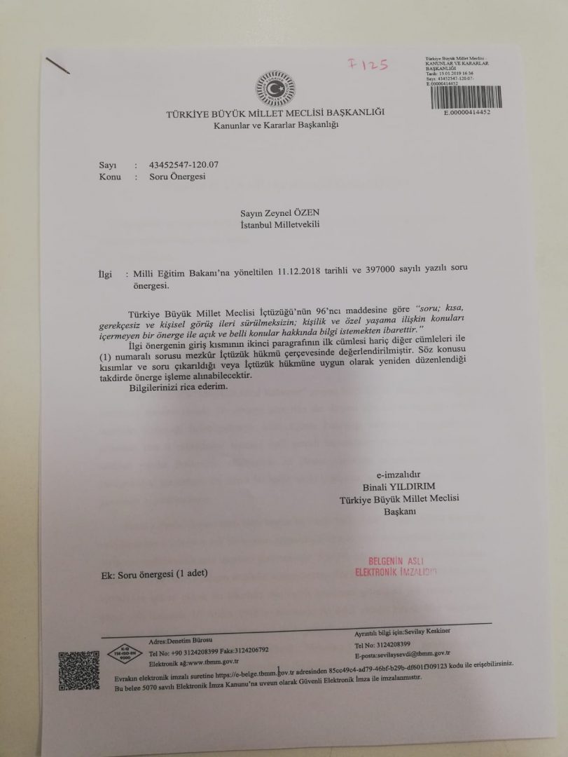Ancak HDP İstanbul Milletvekili Zeynel Özen’in soru önergesi kabul edilmedi. Meclis Başkanı Binali Yıldırım tarafından, önergenin reddedilme gerekçesi Özen’e bildirildi.