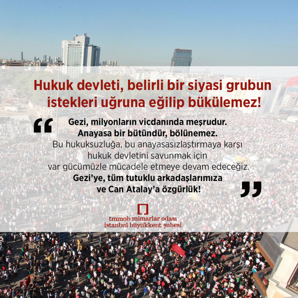 “Yargıtay 3. Ceza Dairesi tarafından imza altına alındığı söylenen belge, bir mahkeme kararından ziyade anayasal düzeni yıkmaya teşebbüs eden bir tehdit mektubu niteliğindedir. Bizler, her ne pahasına olursa olsun hukuk devletini, hukukun üstünlüğünü savunmaya devam edeceğiz. Gezi’den intikam almak ve topluma gözdağı vermek inadı uğruna Türkiye Cumhuriyeti Anayasası’nı yürürlükten kaldırmaya çalışanlara karşı bir kez daha tekrarlıyoruz: Gezi, milyonların vicdanında meşrudur. Anayasa bir bütündür, bölünemez. Hukuk devleti, belirli bir siyasi grubun istekleri uğruna eğilip bükülemez. “Milli irade” adı altında bütün hukuksuzluklarına kılıf uyduranların, her fırsatta sandığa saygı diyenlerin, Hatay halkının iradesini gasp etmesine seyirci kalmayacağız. Bu hukuksuzluğa, bu anayasasızlaştırmaya karşı hukuk devletini savunmak için var gücümüzle mücadele etmeye devam edeceğiz. Gezi’ye, tüm tutuklu arkadaşlarımıza ve Can Atalay’a özgürlük!”