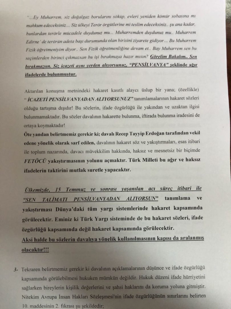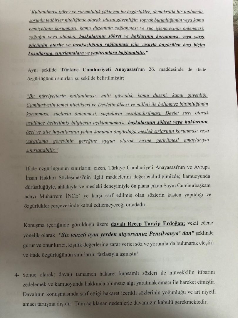 Hazırlanan dava dosyasında; “Konuşma içeriğinde görüldüğü üzere davalı Recep Tayyip Erdoğan; İnce’ye yönelik olarak “Siz icazeti aynı yerden alıyorsunuz Pensilvanya’ dan” şeklinde gurur ve onur kırıcı, kişilik değerlerine zarar verici söz ve yorumlarda bulunarak eleştiri ve ifade özgürlüğünün sınırlarını fazlasıyla aşmıştır!” ifadelerine yer verildi.