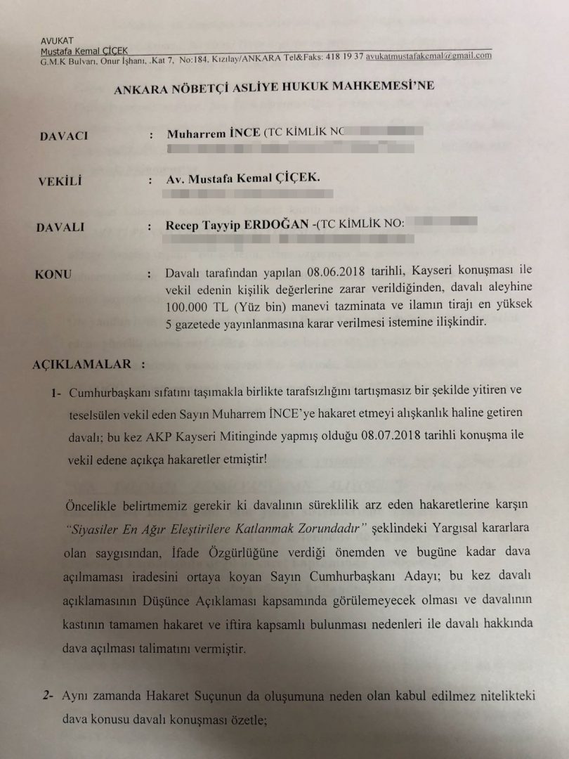 İŞTE İNCE’NİN ERDOĞAN’A AÇTIĞI DAVANIN DOSYASI;