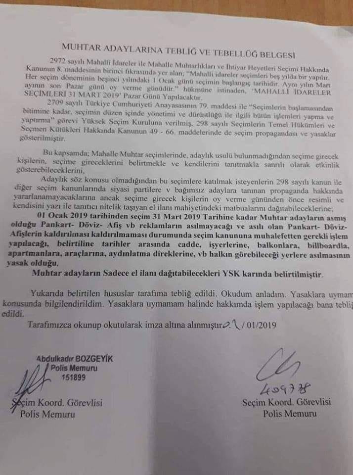 01 Ocak 2019 tarihinden seçim 31 Mart 2019 Tarihine kadar Muhtar adayların asmış olduğu Pankart- Döviz- Afiş vb reklamların aşılmayacağı ve asılı olan Pankart-Döviz-Afişlerin kaldırılması kaldırılmaması durumunda seçim kanununa muhalefetten “erekli işlem yapılacağı, belirtilen tarihler arasında cadde, iş yerlerine, balkonlara, billboardlra. apartmanlara, araçlarına, aydınlatma direklerine vb halkın dürebileceği yerlere asılmasının yasak olduğu. Muhtar adayların sadece el ilanı dağıtabilecekleri YSK karında belirtilmiştir.” (HABER MERKEZİ)