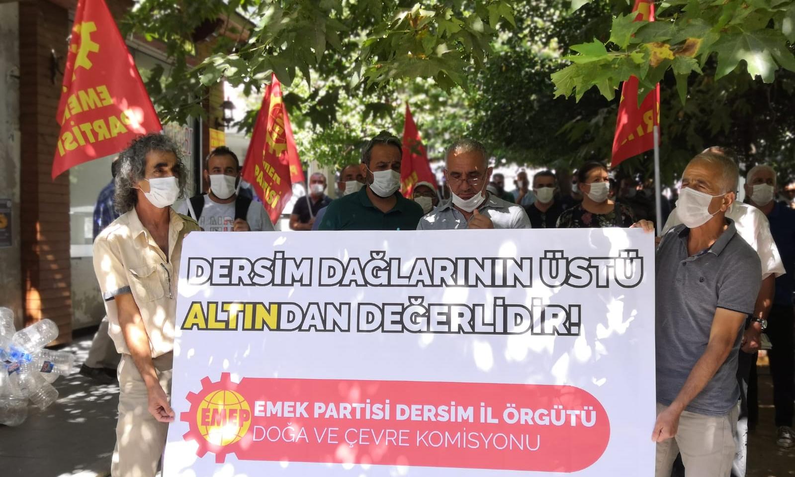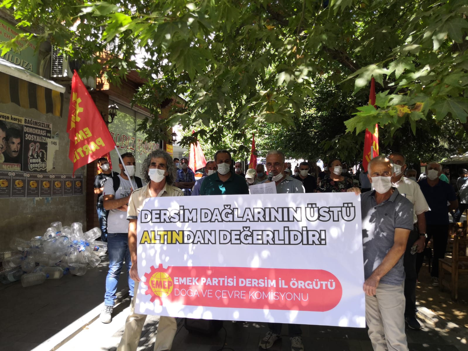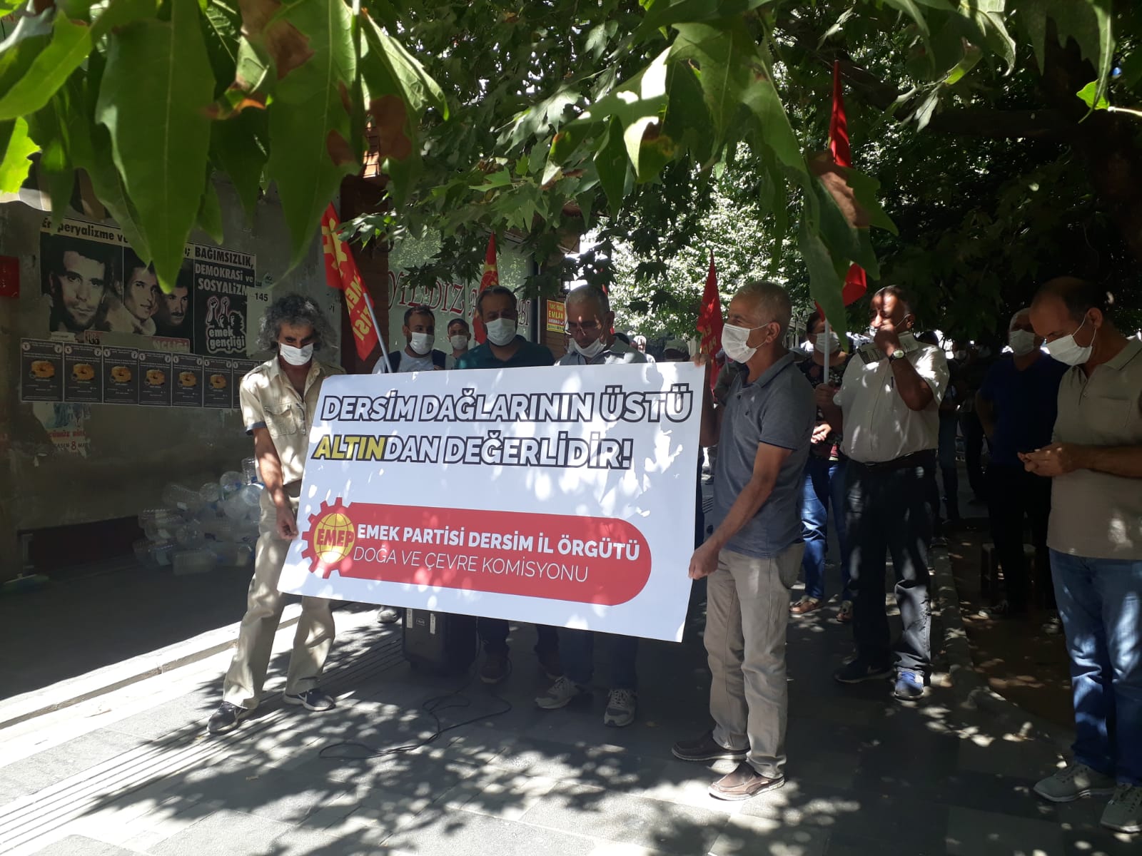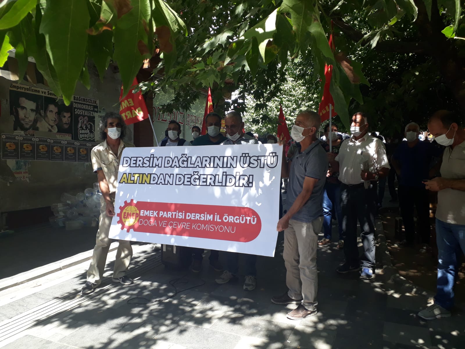 Basın açıklamasında konuşan Emek Partisi il yöneticisi doğa ve çevre komisyon üyesi Hıdır Demir, AKP Hükümeti döneminde çevre talanına dönük uygulamaların artarak devam ettiğini belirterek, “Sermayenin kar hırsı için Ege’nin nefes borusu olan Kaz Dağları’nda kesilen 200 bin ağaç ve dört bir yanı JES’lerle çevrili olduğu için adeta nefes alamayan Aydın’da yeni jeotermal ihaleleri yapıldı. Hasankeyf su altında bırakıldı. 12 bin yıllık kentin kadim kayaları dinamitlerle uçuruldu. Dünyanın en temiz gölleri arasında gösterilen Salda Gölü’ne millet bahçesi yapılması doğal alanlara yönelik tahribatın geldiği noktanın vahametini göstermektedir. Yaklaşık üç aydır Cudi’de süren orman yangınlarına müdahale edilmemesi ve müdahale eden halkın engellenmesi, izahı olmayan bir akıl tutulmasıdır. Tema vakfı tarafında tespit edilen verilere göre; geçen yıl yalnız Sivas’ta 135, Antalya’da 86, Kütahya’da 106, Afyon’da 69, Muğla’da 64, Uşak ve Elazığ’da 56 yerde maden ihalesi açıldı. Gözü doymaz sermaye ve onun iktidarı hedeflerine şimdi de Dersim’in eşsiz coğrafyasını koydular ” dedi.