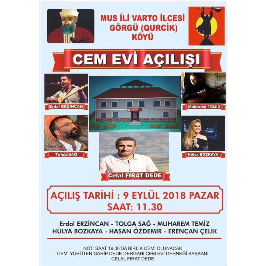 Muş Varto İlçesi’ne bağlı Görgü (Qurcik) Köyü’nde cemevi açılışı yapılacak. 9 Eylül Pazar günü saat 11.30’da yapılacak açılışa Garip Dede Dergahı Başkanı Celal Fırat katılıp birlik cemini yürütecek. Açılışa, Erdal Ezincan, Tolga Sağ, Muharrem Temiz ve Hülya Bozkaya katılacak. (HABER MERKEZİ)