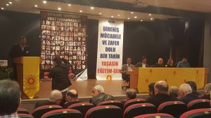 “ Pir Sultan Abdal’ın yetiştirdiği Hınzır paşa, Sivas’a paşa olarak döndüğünde Pir Sultan Abdal’ı ayağına yemek yemeğe çağırır. Pir Sultan da dedi ki ‘Ben değil, benim iki köpeğim var, onlar bile senin yemeğini yemez’, yemedi. Bu ihraçlar da yetmeyecek. Bizi ekmekle terbiye etmek isteyenler görecekler ki, vallahi biz değil, bizim köpeğimiz de yemeyecek. Ya sizi alt edeceğiz, ya da alt edeceğiz. Aslında günümüz, yezid kuşatmasıdır. Yezid Kerbela da direnişçileri açlıkla terbiye edip, iradesini kırıp teslim almaya çalıştı ve ordaki 72 insan nasıl direne direne canını verdi, bugün ihraçlarla, görevden almalarla, sürgünlerle, cezalarla, tutuklamalarla, gözaltılarla irade kırmaya çalışan bir iktidara karşı Eğitim-Senliler asla diz çökmeyeceklerdir.”