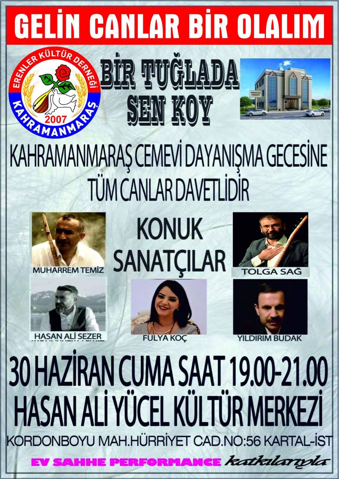 Maraş’ın Yörük Selim Mahallesi’nde yapılacak olan Erenler Cemevi için “Bir tuğla da sen koy” şiarıyla yardımlaşma gecesi düzenlenecek. 30 Haziran Cuma günü saat 19:00 – 21:00 arasında düzenlenecek olan gece İstanbul/Kartal’da Kordonboyu Mahallesi, Hürriyet Caddesi, No: 56 adresinde gerçekleşecek. Gecede sanatçılar Muharrem Temiz, Tolga Sağ, Fulya Koç, Hasan Ali Sezer ve Yıldırım Budak sahneye çıkacak.