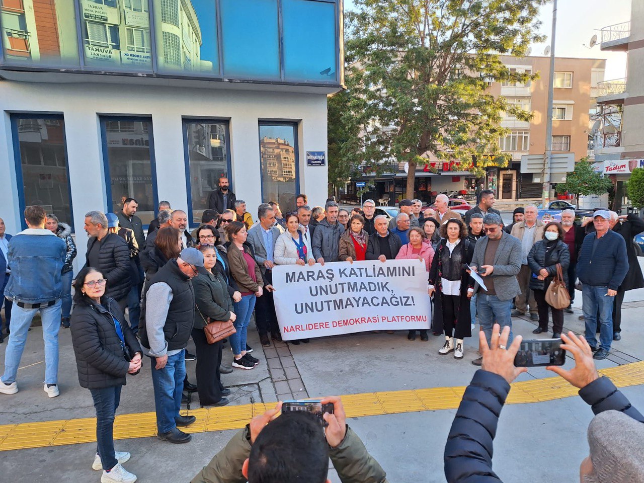 “Geçmişte Maraş’ta, Çorum’da, Sivas’ta acımasızca katliam yapan ırkçı-faşist zihniyet ile kendilerinden farklı düşünenleri ve yaşayanları ‘hain’, ‘düşman’, hatta ‘terörist’ ilan edenler arasında hiçbir fark yoktur. Bu topraklarda insanlığın hedef alındığı onlarca katliamı ve bu katliamların arkasındaki kirli ilişkileri unutturmamak, hafızalarımızdan sildirmemek için bugün buradayız ve bu anmayı yapıyoruz. Kuşkusuz bu hepimizin görevidir. Üzerinden ne kadar süre geçmiş olursa olsun, insanlığa karşı işlenmiş suç olarak tarihe geçmiş olan Maraş, Çorum, Sivas ve 10 Ekim Ankara katliamlarını ve arkasındaki güçleri unutmamız mümkün değildir. Narlıdere Demokrasi Platformu olarak, Maraş katliamı nezdinde dünyada yaşanan bütün katliamlarda kaybettiğimiz bütün canları bir kez daha saygıyla anıyoruz ve dünyanın neresinde yaşanırsa yaşansın ‘insanlığa karşı suç’ niteliğinde olan bütün katliamları, ayrım yapmaksızın lanetliyoruz.