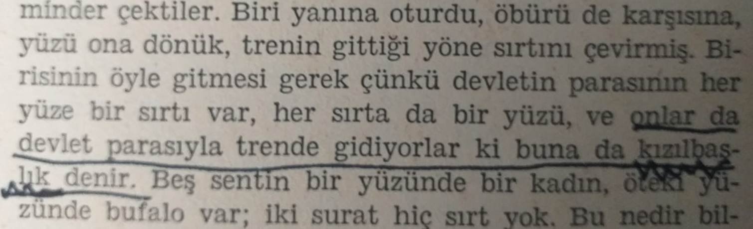 “Birisinin öyle gitmesi gerek çünkü devletin parasının her yüze bir sırtı var, her sırta da bir yüzü ve onlar da devlet parasıyla trende gidiyorlar ki buna da kızılbaşlık denir.”