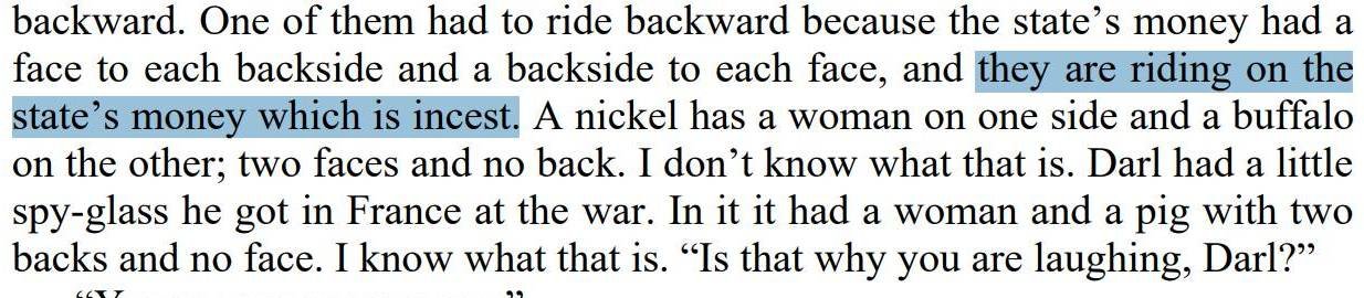 Yazar Taylan Kara’nın yazısına göre Murat Belge aslı “One of them had to ride backward because the state’s money had a face to each backside and a backside to each face, and they are riding on the state’s money which is incest” olan cümleyi şu şekilde çevirmiş: