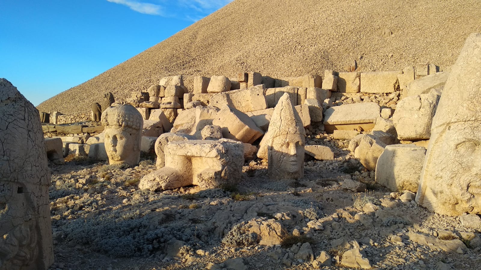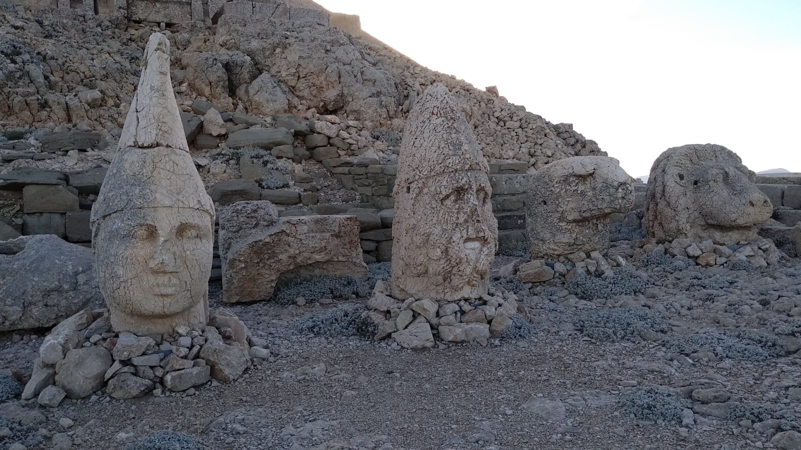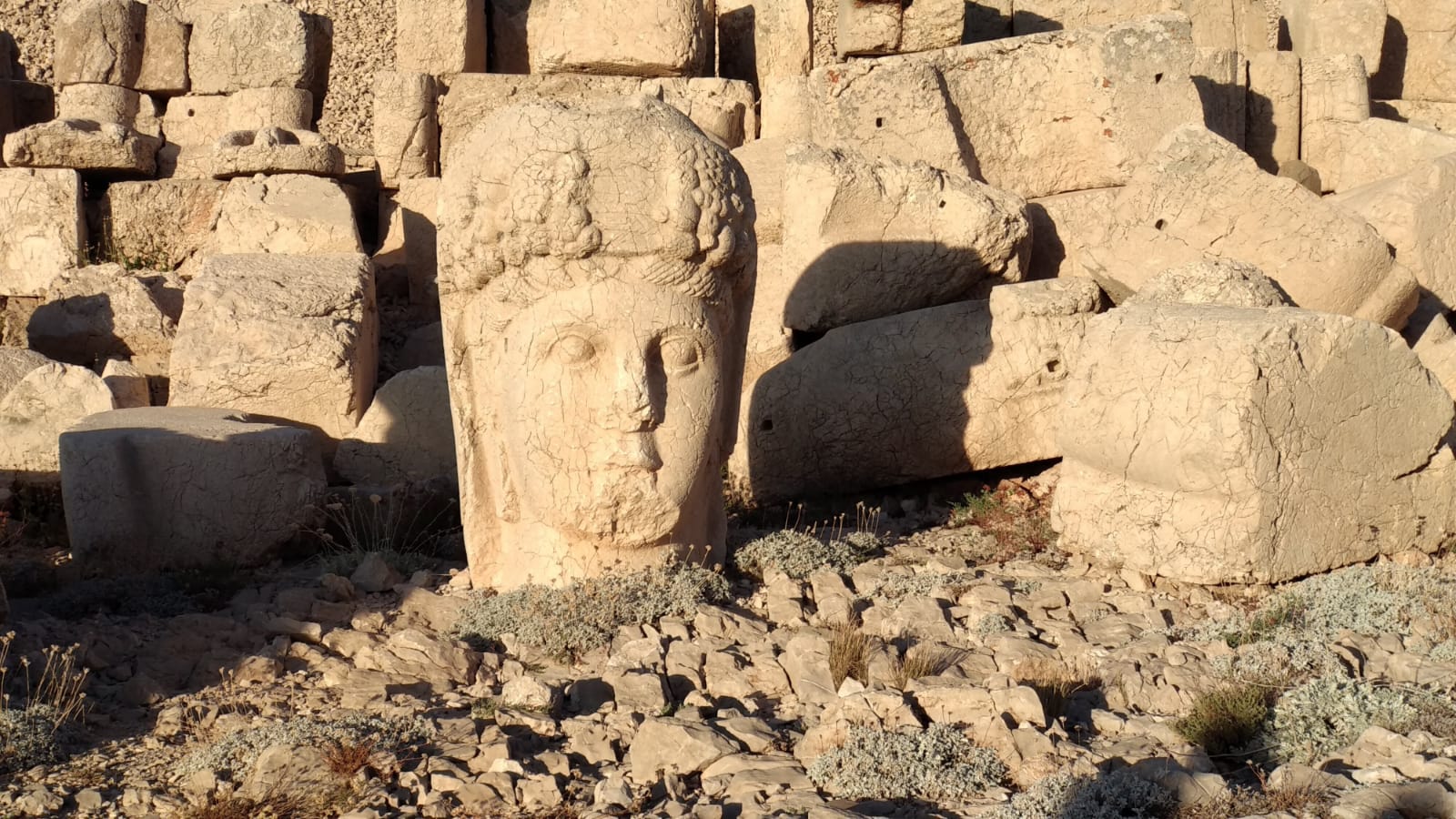 Adıyaman’ın Kahta ilçesinde 2150 metre yükseklikte yer alan Nemrut Dağı, 2 bin yıllık bir kültürel zenginliğe sahip. Milattan önce 1’inci yüzyılda Nemrut Dağı ve çevresinde kurulan Kommagene Krallığı 141 yıl boyunca bu bölgede hüküm sürmüş, milattan sonra 72 yılında da Roma hakimiyetine girmiştir. Nemrut Dağı üzerinde bulunan tarihi eserler Kommagene Krallığı’na aittir. 1881 yılında bölgede yol yapımında çalışan Alman mühendis Karl Sester, eserlerin üzerindeki Grekçe yazıları çözüp bu heykel ve eserlerin Kommagene Krallığı’na ait olduğunu ve kral 1’inci Antiochos’un emriyle yapıldığını keşfetmiştir. Kommagene Kralı I. Antiochos’un tanrılara ve atalarına minnettarlığını göstermek için yaptırdığı mezarı, anıtsal heykelleri ve benzersiz manzarası ile Helenistik Dönemin en görkemli kalıntılarından birisidir. Anıtsal heykeller doğu, batı ve kuzey teraslarına yayılmıştır. Doğu terası kutsal merkezdir ve bu nedenle en önemli heykel ve mimari kalıntılar burada bulunmaktadır. İyi korunmuş durumdaki dev heykeller kireç taşı bloklarından yapılmıştır ve 8-10 metre yüksekliktedir.