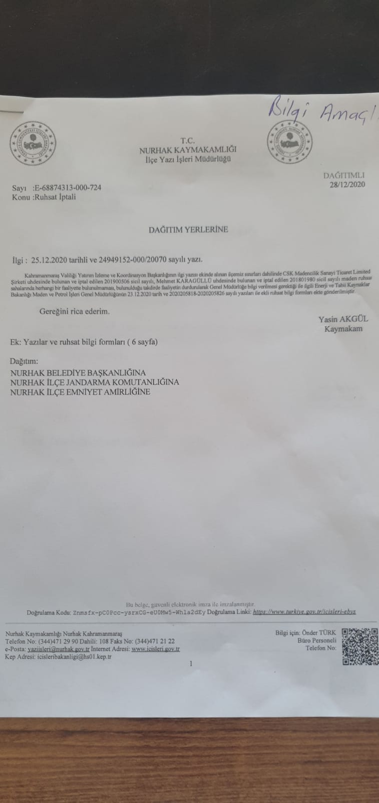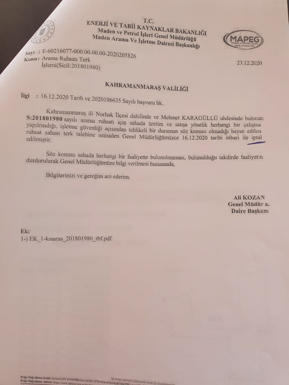 Maraş Valiliği’nce gönderilen yazıda, “Kahramanmaraş ili Nurhak İlçesi dahilinde ve Mehmet KARAGÜLLÜ uhdesinde bulunan arama ruhsatı için sahada üretim ve satışa yönelik herhangi bir çalışma yapılmadığı işletme güvenliği açısından tehlikeli bir durumun söz konusu olmadığı beyan edilen ruhsat sahası terk talebine istinaden Gnel Müdürlüğümüzce 16.12.2020 tarihi itibari ile iptal edilmiştir” ifadelerine yer verildi.