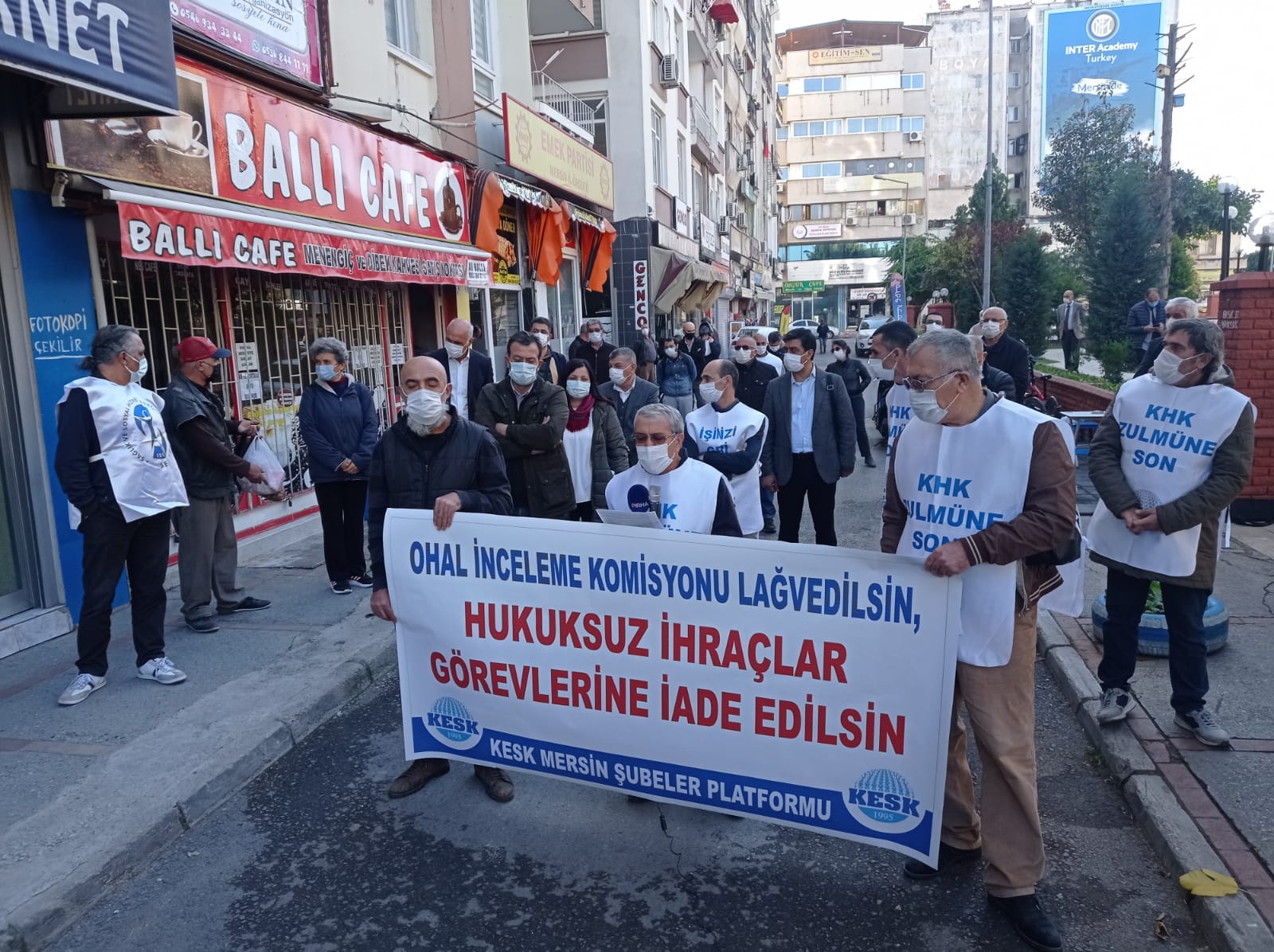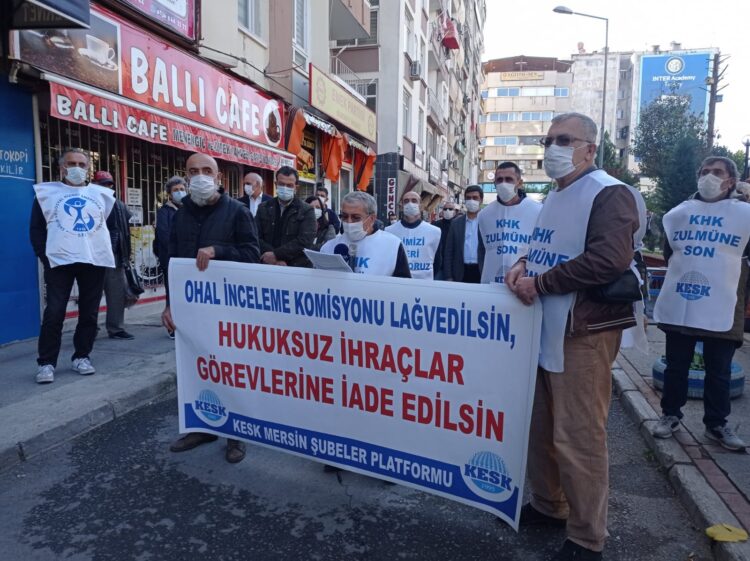 KESK Mersin Şubeler Platformu da, Özgür Çocuk Parkı’nda açıklama yaptı. “OHAL İnceleme Komisyonu lağvedilsin, hukuksuz ihraçlar görevlerine iade edilsin” pankartını açan KESK’liler adına açıklama yapan Platformu Dönem Sözcüsü Mahmut Sümbül, pandemi sürecinde sendikal hak ihlallerinde bir azalmaya yol açmadığını, aksine sendikal hak ve özgürlüklerin fiili olarak yasaklar kapsamına alındığını ifade etti.