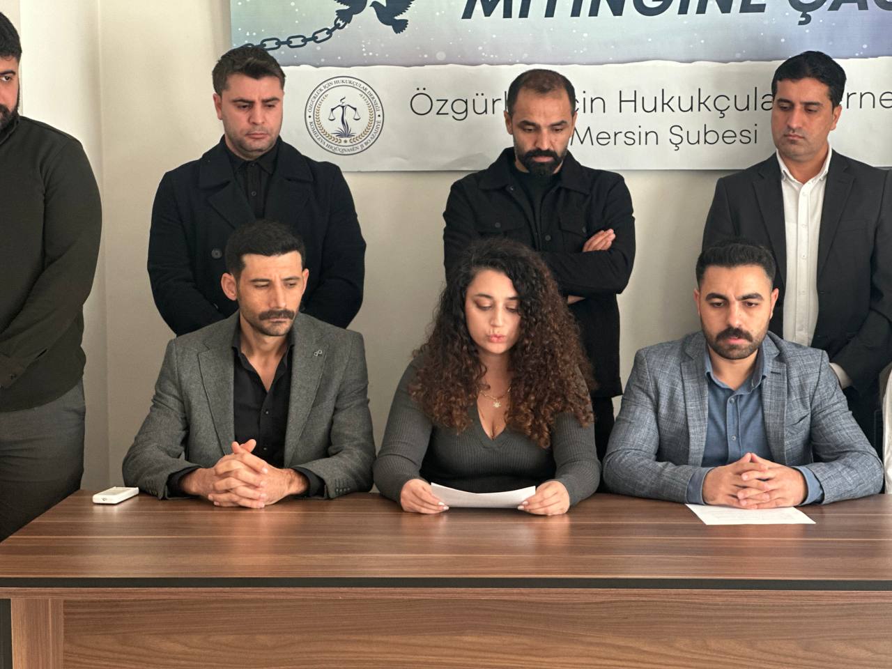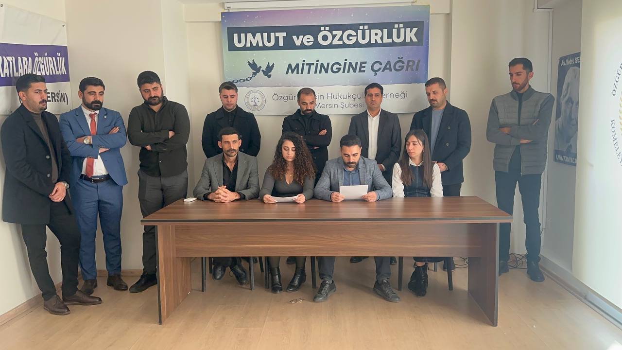 Özgürlük İçin Hukukçular Derneği (ÖHD) Mersin Şubesi, Abdullah Öcalan’ın fiziki özgürlüğünün sağlanması talebiyle 4 Ocak’ta Diyarbakır İstasyon Meydanı’nda gerçekleştirilecek “Umut ve Özgürlük” mitingine dair açıklama yaptı. Dernek binasında gerçekleştirilen açıklamaya, çok sayıda hukukçu katıldı. Metnin Kürtçesini Muammer Derince, Türkçesini ise ÖHD Mersin Şube Eş Başkanı Melek Şaraldı okudu.