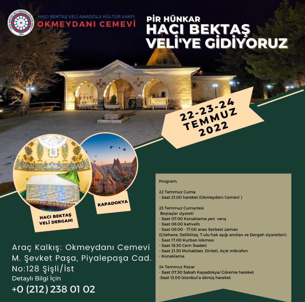 Hacı Bektaş Veli Anadolu Kültür Vakfı (HBVAKV) Okmeydanı Cemevi, 22-23-24 Temmuz tarihlerinde Hacı Bektaş Veli Dergahına ziyaret gerçekleştireceğini duyurdu.