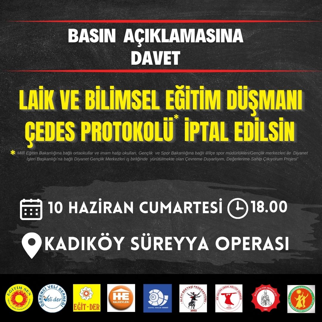 Laik ve bilimsel eğitim karşı uygulamaya konulan ÇEDES Protokolü’nün iptal edilmesi için Eğitim-Sen, Öğrenci Veli derneği (Veli-Der), Eğitimciler Derneği (Eğit-Der), HalkEvleri, Sosyal Hak Derneği, Alevi Bektaşi Federasyonu (ABF), Pir Sultan Abdal Kültür Derneği (PSKAD), Alevi Kültür dernekleri (AKD) ve Demokratik Alevi Dernekleri (DAD) 10 Haziran Cumartesi günü saat 18.00’de Kadıköy Süreyya Operası önünde basın açıklaması yapacaklar. Açıklamaya herkes davet edildi.