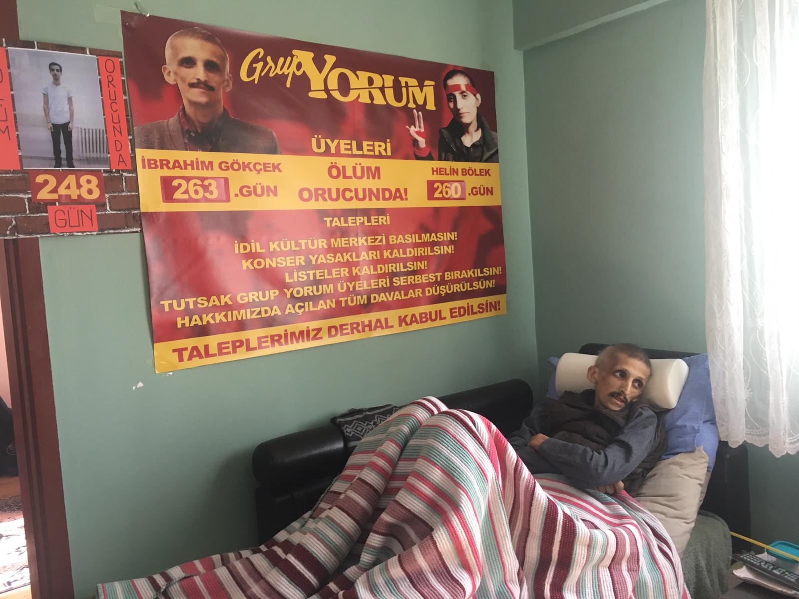 263 gündür ölüm orucunda olan Grup Yorum Üyesi İbrahim Gökçek “Direnişimiz devrimci ruhumuzda kutsaldır. Direnişimizi sürdürmeye, taleplerimizi kabul ettirmek istiyoruz. Sonuna kadar direneceğiz. Amacımız ölmek değil. Yaşamak istiyoruz. Yeni besteler yapmak, yeni konserler vermek istiyoruz. Bunları istemek çok mu büyük şeyler değil. Bu taleplerimiz kabul edildikten sonra birlikte güneşli günleri selamlayacağız. Bizler sadece özgürce şarkı söylemek istiyoruz” dedi. Gökçek “Direnmeyi, baş eğmemeyi Pir Sultanlardan öğrendik” dedi.