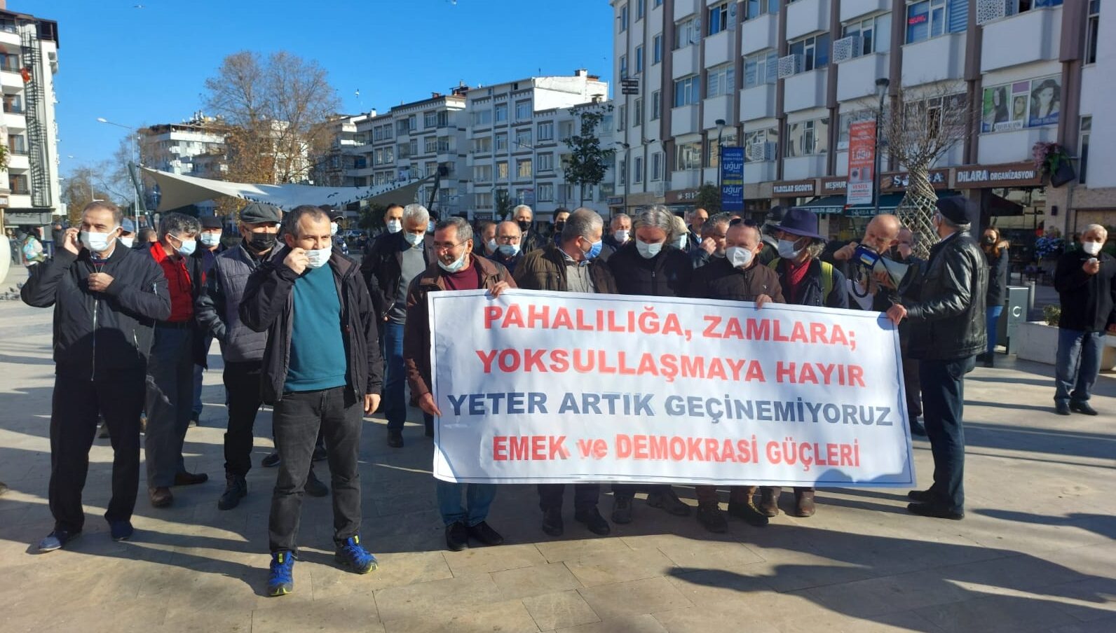 Demokrasi güçleri adına basın açıklamasını okuyan Ertuğrul Gazi Gönül, “Hayat pahalılığı ve zamlara artık yeter diyoruz! Her şeye tek kişinin karar verdiği ucube sistem ülkeyi büyük bir çöküşe sürükledi. Öyle ki; ülkede bugün kıtlık var! Açlık var! Yoksulluk var!” dedi.