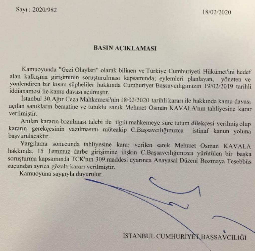Yargılama sonucunda tahliyesine karar verilen sanık Mehmet Osman KAVALA hakkında, 15 Temmuz darbe girişimine İlişkin C.Başsavc111ğımızca yürütülen bir başka soruşturma kapsamında TCK’nın 309.maddesi uyarınca Anayasal Düzeni Bozmaya Teşebbüs suçundan ayrıca gözaltı karan verilmiştir. Kamuoyuna saygıyla duyurulur.”