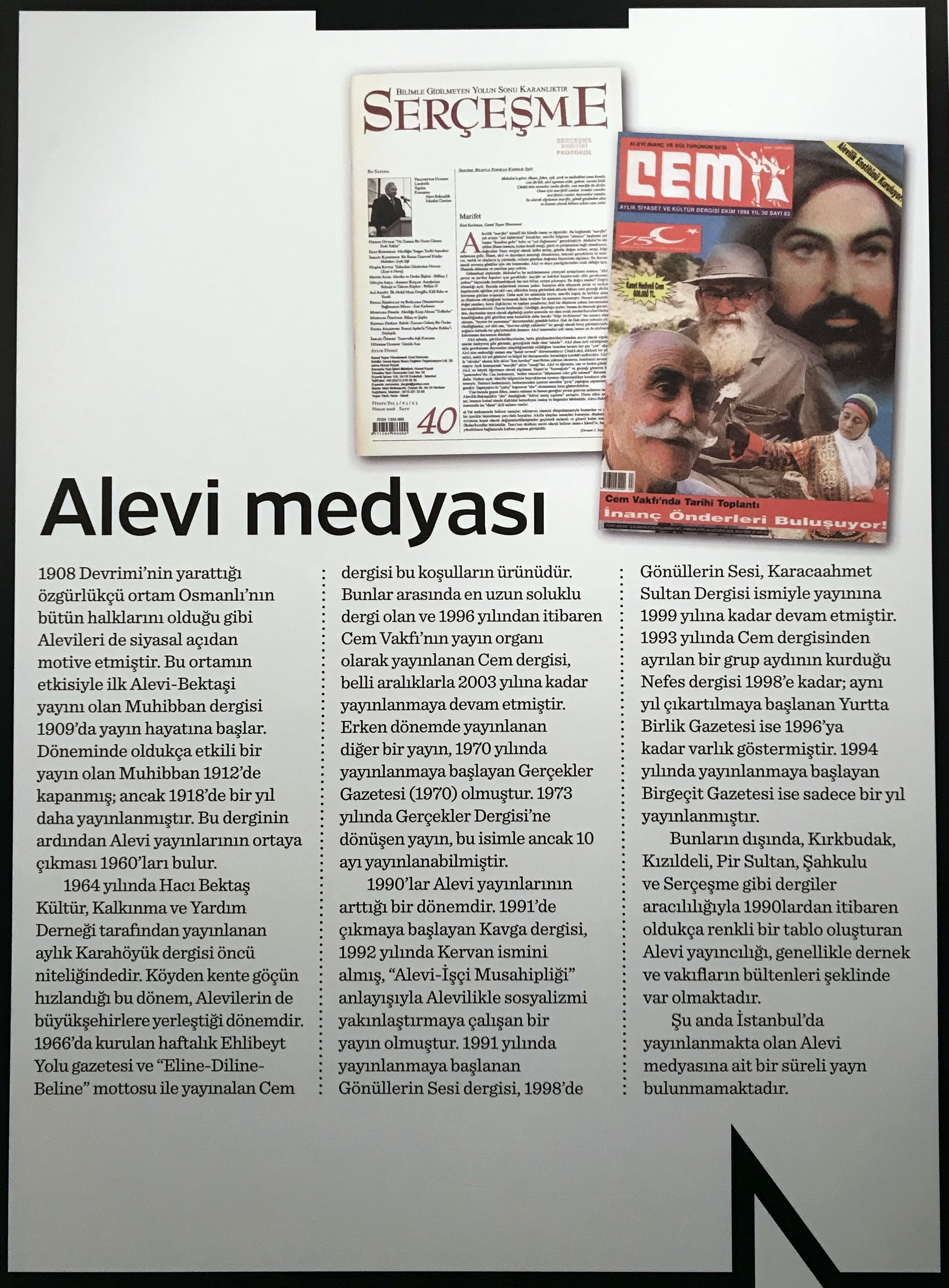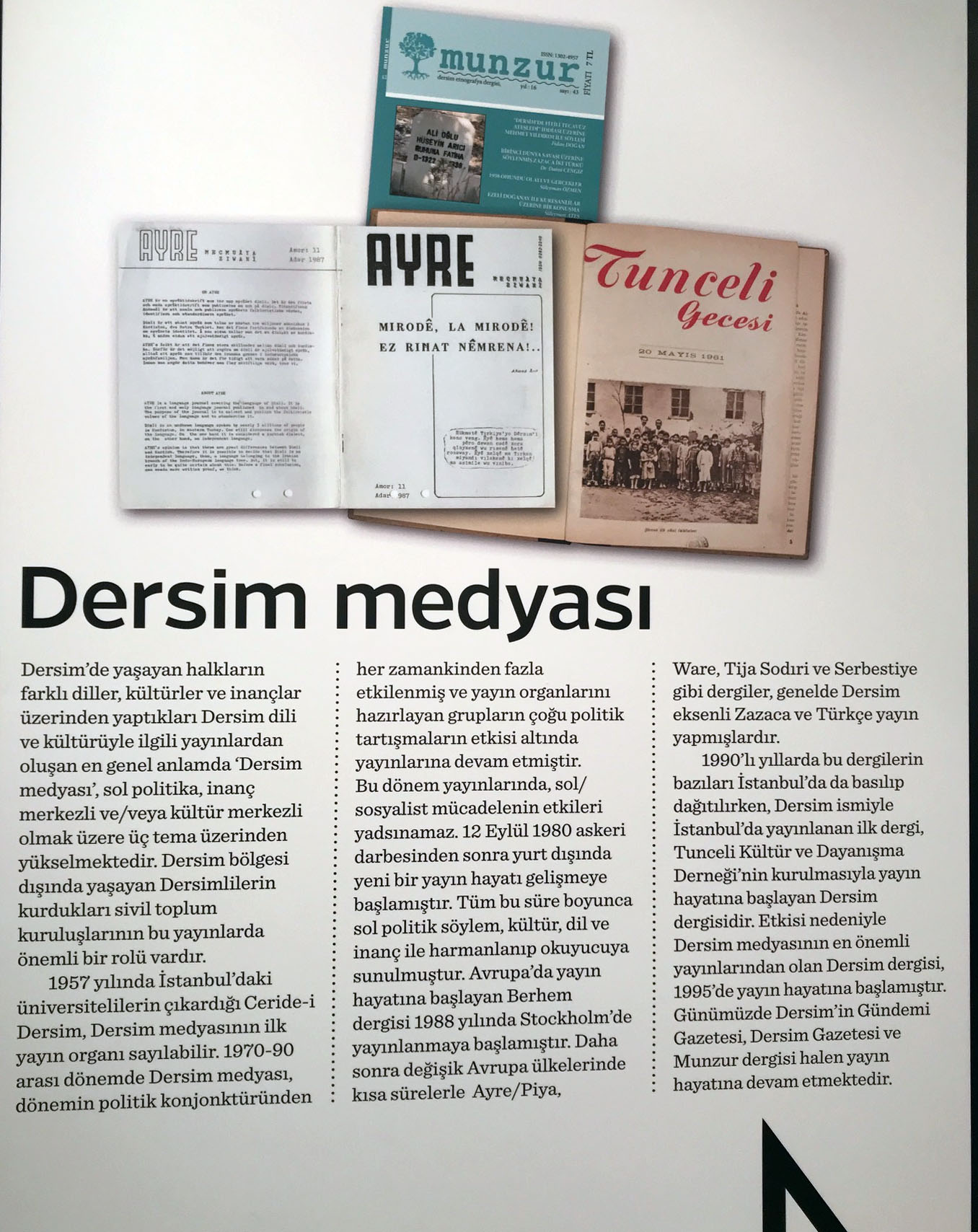 Sergide, Dersim medyasının bağımsız kategori olarak sunulması ilgi çekici bir ayrıntı oluşturmuş! Alevi medyası hariç diğer yayınlar, ulusal aidiyetleri (Ermeni, Yahudi, Rum, Laz, Çerkes vb) üzerinden isimlendirilmişken Dersim medyası, Kürt (Kurmanc ve Kırmanc/Zaza) medyasından ayrı tutulmuş…