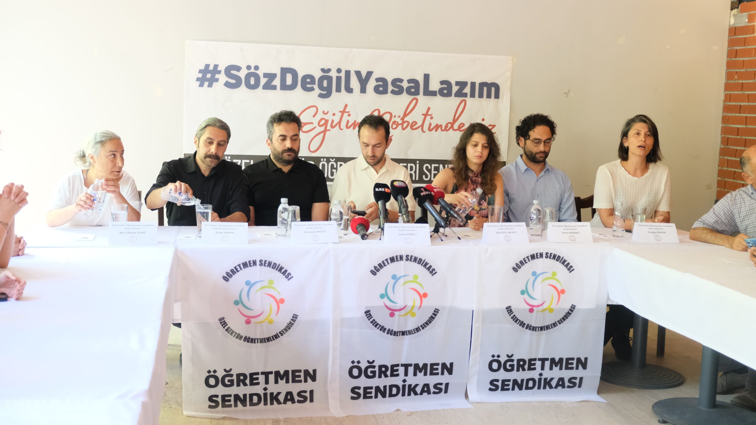 Mülkiyeliler Birliği binasında yapılan açıklamada basın metnini Özel Sektör Öğretmenleri Sendikası Genel Sekreteri Umut Erkurt okudu.