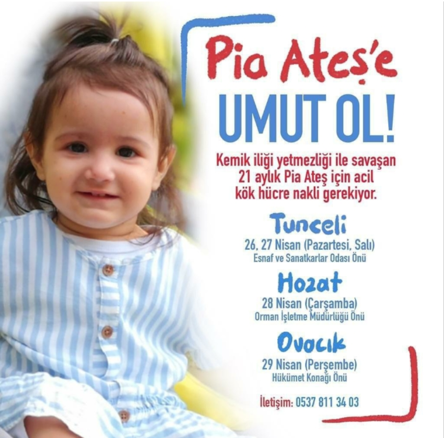 Pia Ateş‘in ailesi, 3 aydır hastanede tedavi gören kızlarının ilik nakli olarak tedaviye kavuşması için kampanya başlattı. 21 aylık ve ilik yetmezliğinden dolayı 3 aydır hastanede tedavi gören Pia Ateş için Dersim’de 26-27 Nisan’da Esnaf ve Sanatkarlar odası önünde, Hozat’ta 28 Nisan’da Orman İşletme Müdürlüğü önünde, Ovacık’ta ise 29 Nisan’da Hükümet Konağı önünde kök hücre ve kan bağışı için Kızılay çadırı kurulacak.
