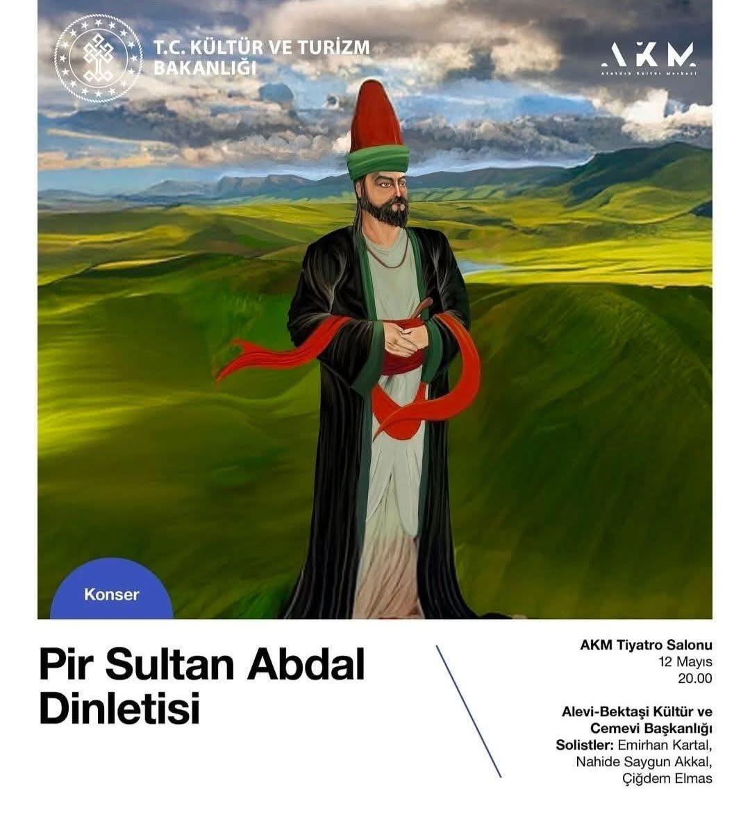 Kültür ve Turizm Bakanlığı’na bağlı Alevi Bektaşi ve Cemevi Başkanlığı’nın düzenlediği ‘Pir Sultan Abdal Dinletisi’ adlı etkinlikte Pir Sultan Abdal’ın portesindeki sazı kaldırılarak, yerine elleri rüku şeklinde bağlanmış ve boynundaki teslim taşı kolye olmuş bir Pir Sultan portesi yayınladı.
