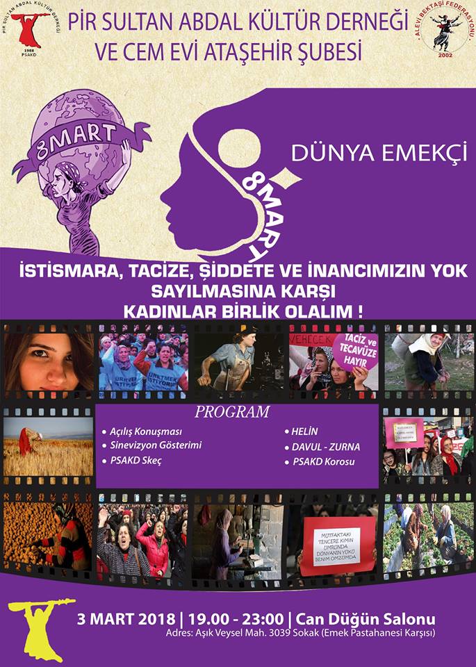 Pir Sultan Abdal Kültür Derneği Ataşehir Cemevi, 8 Mart Dünya Emekçi Kadınlar Günü etkinliği düzenleyecek. Etkinlik “İstismara, tacize, şiddete ve inancımızın yok sayılmasına karşı, kadınlar birlik olalım” şiarıyla 3 Mart saat 19.00’da Can Düğün Salonu’nda gerçekleşecek.