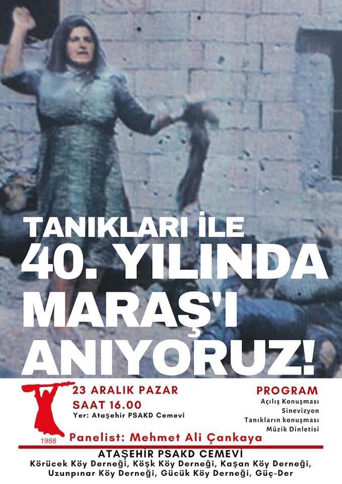 PSAKD Ataşehir Cemevi, Maraş Katliamı’nın 40. yılında tanıklarıyla bir anma programı düzenleyecek. 23 Aralık Pazar günü saat 16.00’da yapılacak anmada sinevizyon gösterimi ve tanıkların konuşmaları yapılacak. Anma programına panelist olarak Mehmet Ali Çankaya katılacak. Anmada kısa bir müzik dinletisi de yapılacak.