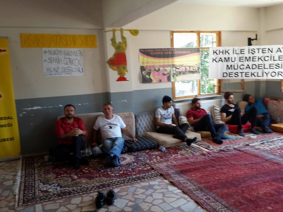 Pir Sultan Abdal Kültür Derneği Ataşehir Şubesi 137 gündür açlık grevinde olan eğitimci Semih Özakça ve Nuriye Gülmen için iki günlük açlık grevi başlattı. “İnsanlık ölmesin. Nuriye ve Semih yaşasın talepleri kabul edilsin”demek için başlattıkları açlık grevinde cemevine “KHK ile işten atılan kamu emekçilerinin mücadelesini destekliyoruz” pankartı asarak işlerinden edilen kamu emekçilerinin de yanlarında olduklarını vurguladı.