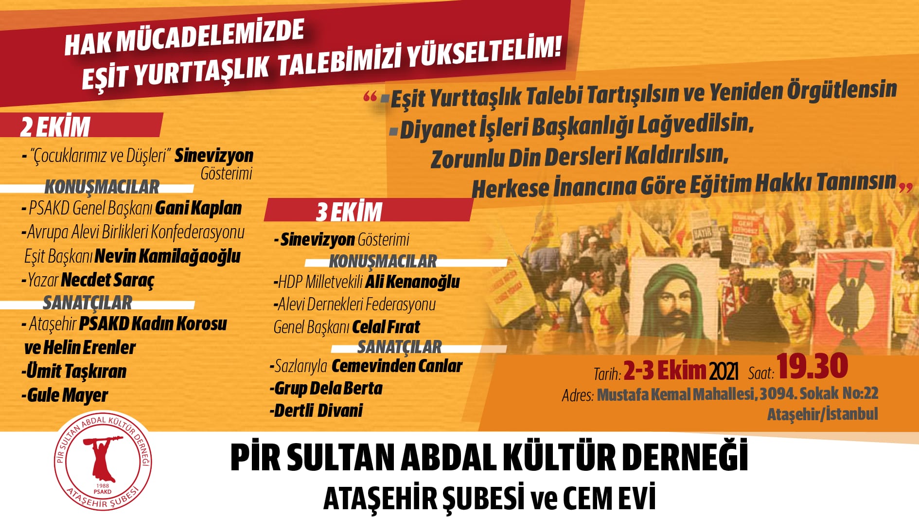 Pir Sultan Abdal Kültür Derneği (PSAKD) Ataşehir Şubesi ve Cemevi, “Hak Mücadelemizde Eşit Yurttaşlık Talebimizi Yükseltelim” başlığıyla 2-3 Ekim 2021 tarihlerinde etkinlikler düzenleyecek. İki gün sürecek etkinlikler Hacı Bektaş Veli’ye atfedilirken; “Eşit yurttaşlık talebi tartışılsın ve yeniden örgütlensin; Diyanet İşleri Başkanlığı lağvedilsin; zorunlu din dersleri kaldırılsın; herkese inancına göre eğitim hakkı tanınsın” gibi talepler bir kez daha dillendirilecek.