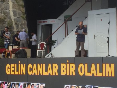 Madımak şehitleri başta olmak üzere tüm barış, eşitlik, kardeşlik ve demokrasi yolunda şehit düşenler için bir dakikalık saygı duruşuyla başlayan etkinliğe cezaevinde tutuklu bulunan PSAKD yöneticileri Erol Yeter ve Akın Demir mesaj yolladı. Yollanan mesajda zorlu bir süreçten geçildiği ve bu süreçte Sivas Katliamı’nın anmasına katılmanın önemine vurgu yapıldı.