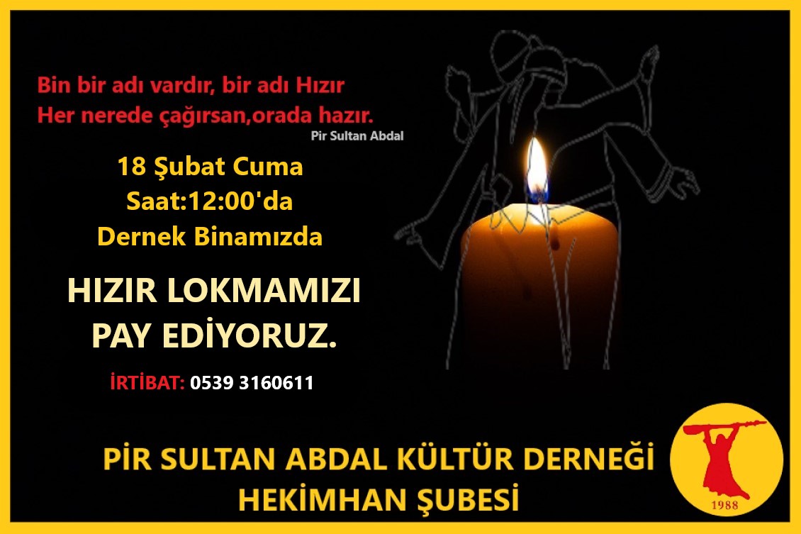 PİRHA-Pir Sultan Abdal Kültür Derneği (PSAKD) Malatya Hekimhan Şubesi 18 Şubat Cuma günü saat 12.00’de Hızır lokmalarını paylaşacak.