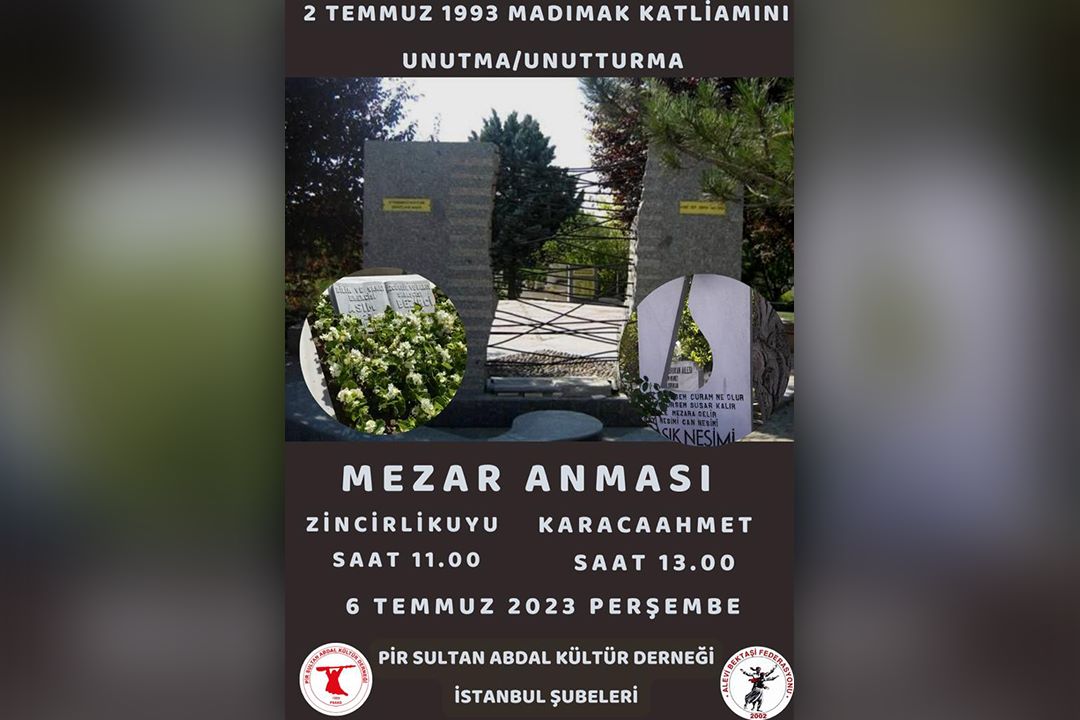 Pir Sultan Abdal Kültür Derneği (PSAKD) İstanbul Şubeleri, “2 Temmuz 1993 Madımak Katliamı’nı Unutma Unutturma” diyerek 6 Temmuz Perşembe günü saat 11.00’de Zincirlikuyu Mezarlığı’nda, saat 13.00’te ise Karacaahmet Mezarlığı’nda Sivas Katliamı’nda yaşamını yitirenleri mezarları başında anacak.