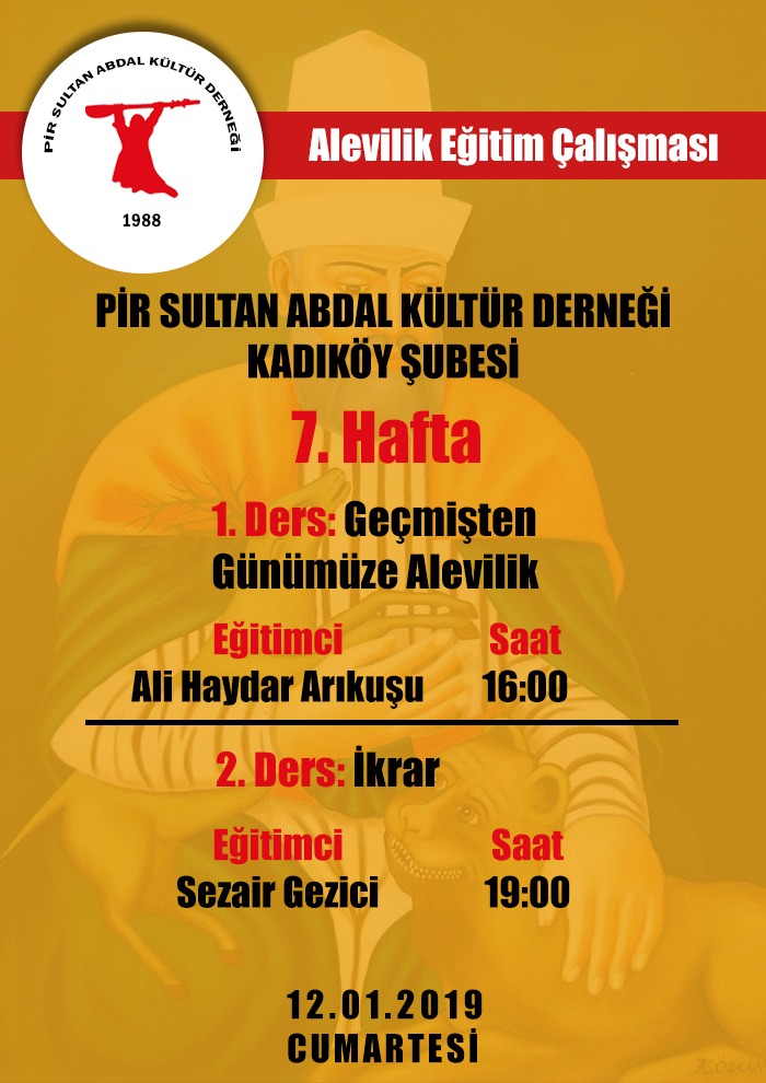 7. Hafta eğitimlerinde Sezair Gezici ikrar konusunu anlatacak. PSAKD Genel Merkez yöneticilerinden Ali Haydar Arıkuşu da ‘Geçmişten Günümüze Alevilik’ konusuyla sunumunu yapacak.