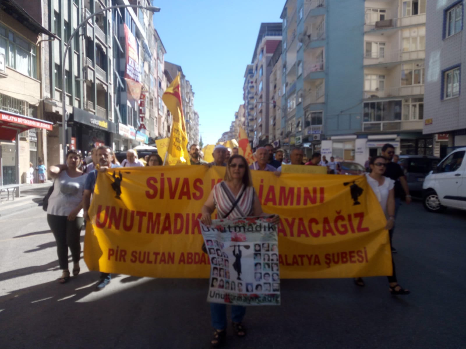 Sivas katliamını kınamak amacıyla Malatya’daki sivil toplum kuruluşları ve siyasi partiler bir araya gelerek yürüyüşlü eylem gerçekleştirdiler. Yürüyüşte; ” Önderimiz Pirsultan Abdal’ın “Dönen Dönsün Ben Dönmezem Yolumdan” şiarıyla Sivas Madımak Katliamının 26. yılında Sivas Madımak Oteli önünde buluşalım. Sivas Madımak Katliamını Unutmadık Unutmayacağız” denilerek çağrıda bulunuldu.