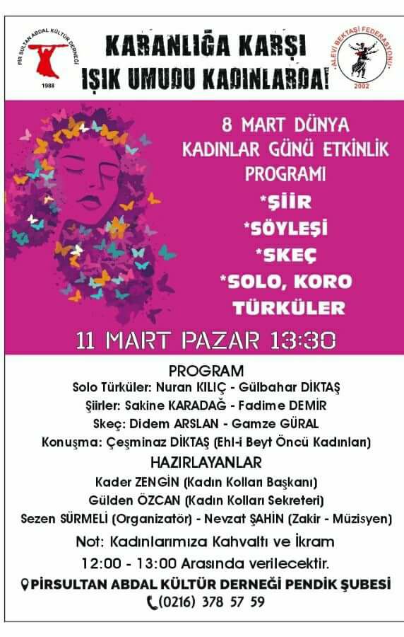 Kadınlar Günü içi Pir Sultan Abdal Kültür Derneği Pendik Şubesi’nde türkü, şiir dinletisi, skeç programı yapılacak. 11 Mart Pazar günü saat 13.30’da düzenlenecek olan etkinlikte ayrıca 12.00-13.00 arası kahvaltı etkinliği düzenlenecek.