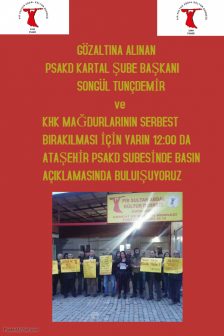 Gözaltına alınan Pir Sultan Abdal Kültür Derneği Kartal şube başkanı Songül Tunçdemir ve KHK mağdurlarının serbest bırakılması için yarın 11:00’de PSAKD Kartal şubede ve 12.00’de de Ataşehir PSAKD şubesinde basın açıklaması yapılacak.