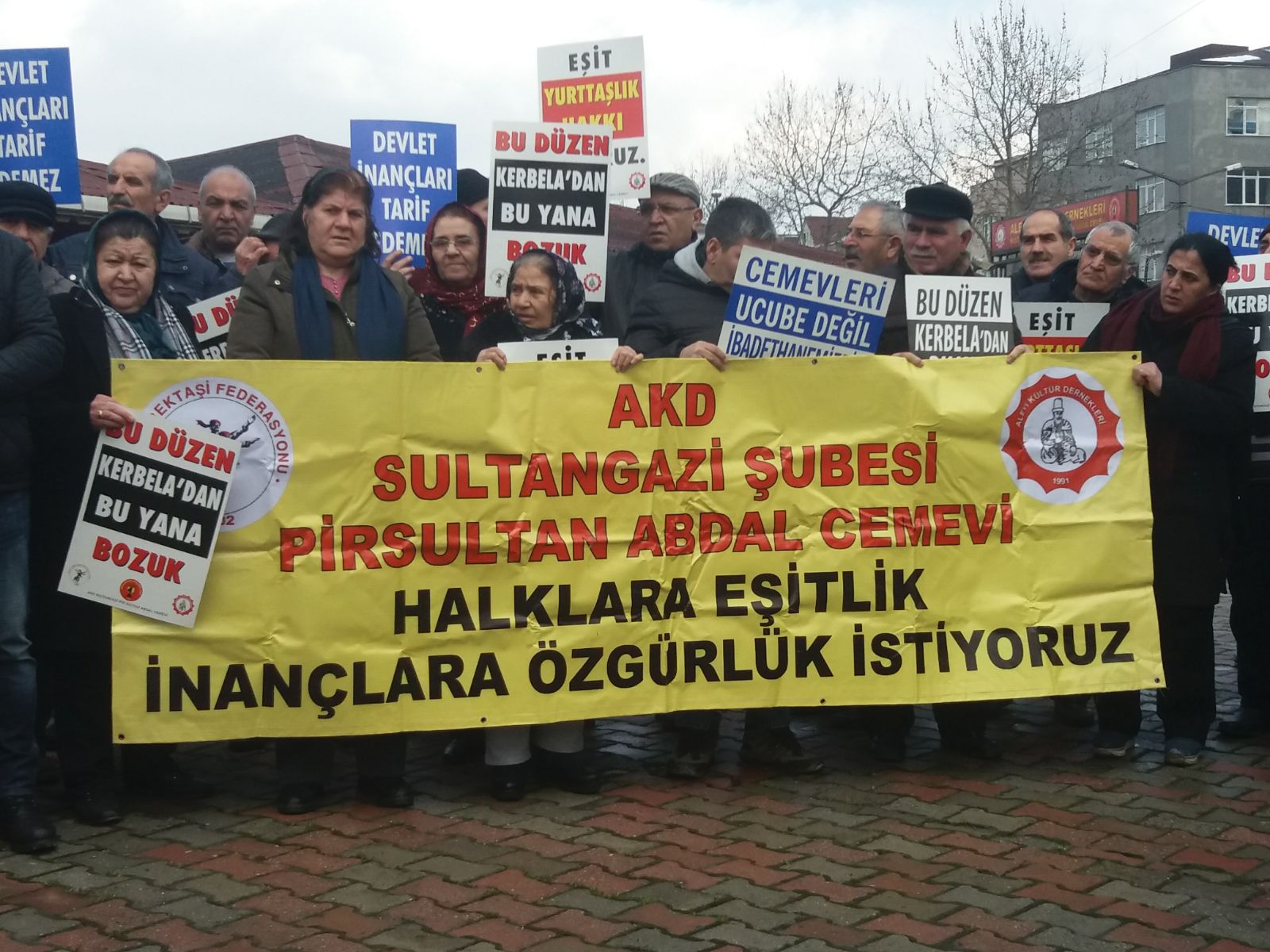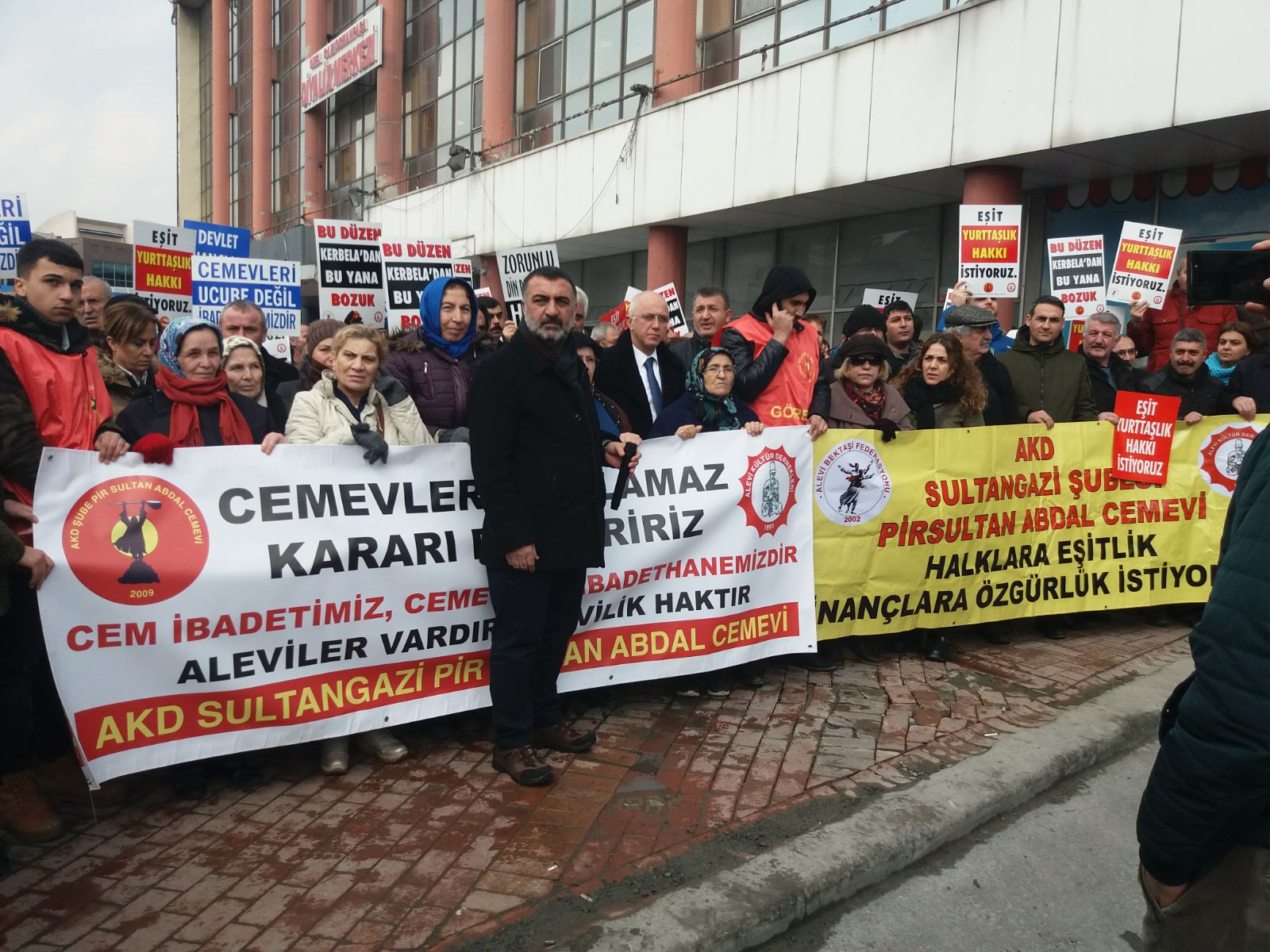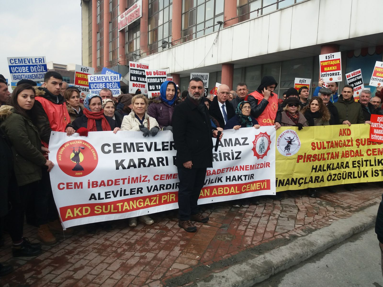 Mahkeme öncesi İstanbul’un Sultangazi ilçesindeki Sultangazi Pir Sultan Abdal Cemevi önünde tüm Alevi kurumları ve vatandaşları bir araya geldi.