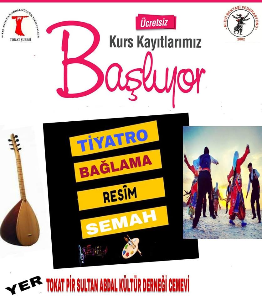 Pir Sultan Abdal Kültür Derneği Tokat Şubesi’nde ücretsiz kurslar için kayıt döneminin başladığını duyurdu. Ücretsiz verilecek Semah, tiyatro, bağlama ve resim kursu için PSAKD Tokat Cemevi’ne isim yazdırmaları gerekir.