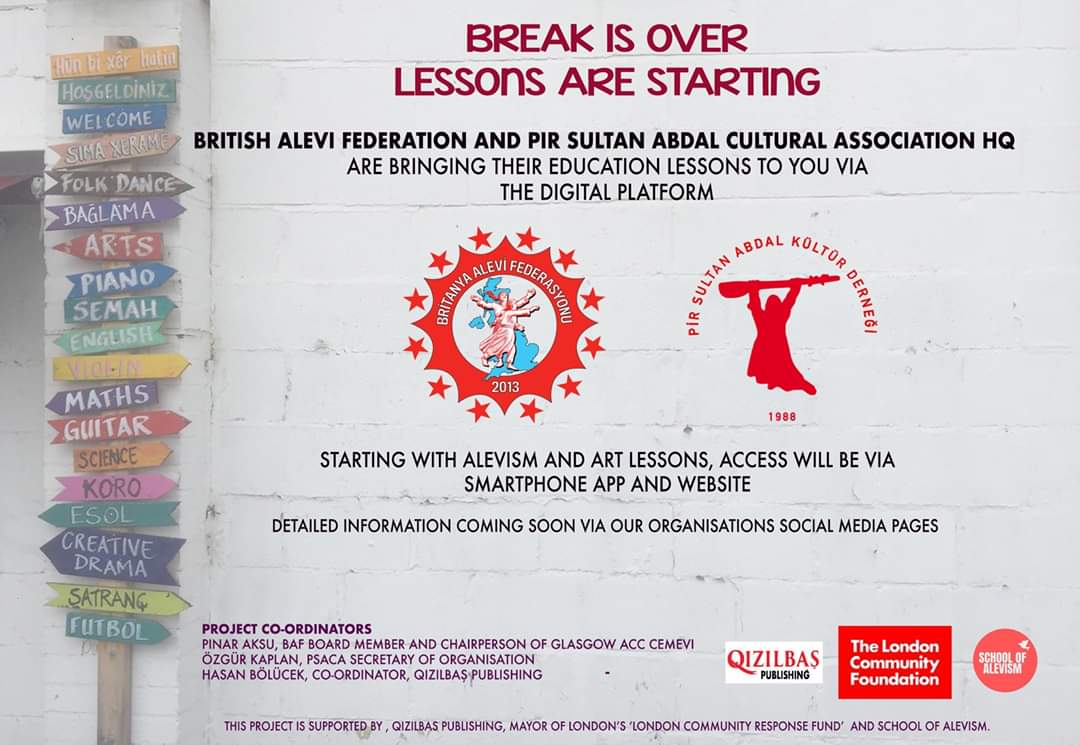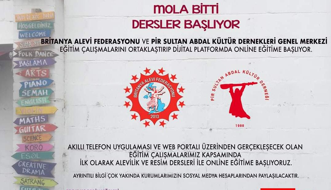 “Mola bitti, dersler başlıyor” diyen Pir Sultan Abdal Kültür Derneği(PSAKD) Genel Merkezi ve Britanya Alevi Federasyonu eğitim çalışmasını ortaklaştırıp, dijital platformda online eğitim başlatıyor.