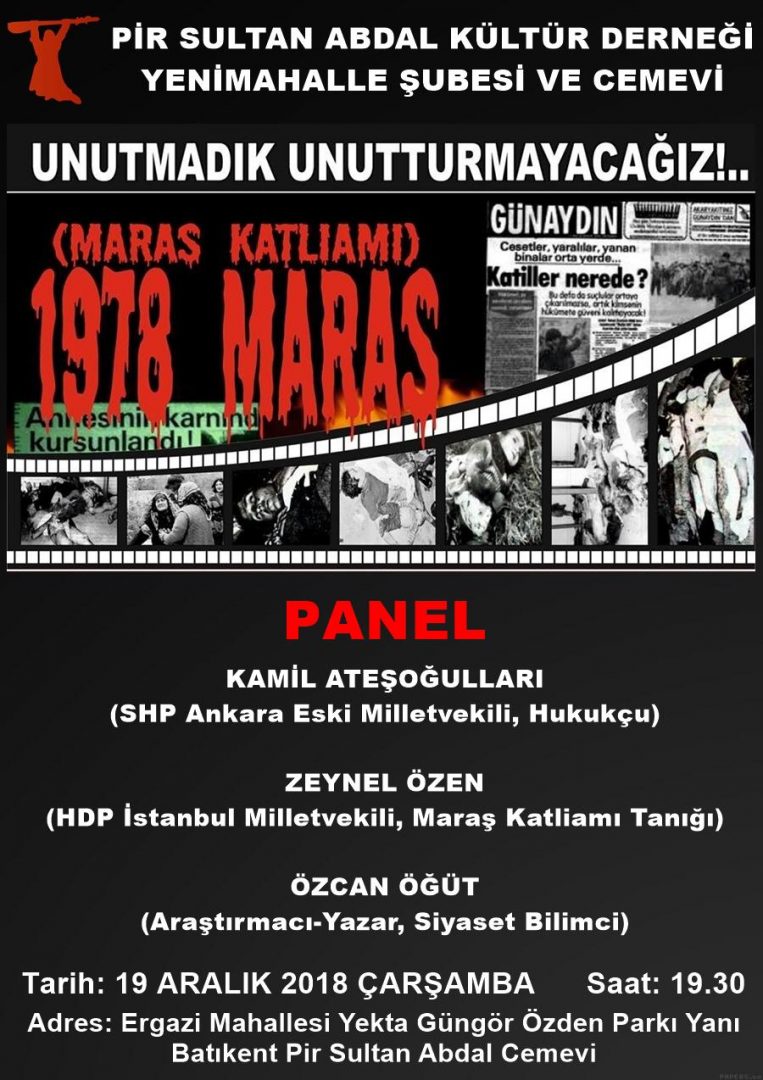 Ankara’da bulunan Pir Sultan Abdal Kültür Derneği Yenimahalle Şubesi ve Cemevi, ‘Maraş Katliamını Unutmadık, Unutmayacağız’ şiarıyla panel düzenleyecek. 19 Aralık Çarşamba günü saat 19.30’da başlayacak panele SHP Ankara eski Milletvekili ve hukukçu Kamil Ateşoğlulları, HDP İstanbul Milletvekili Zeynel Özen ve Araştırmacı Yazar Özcan Öğüt katılacak.
