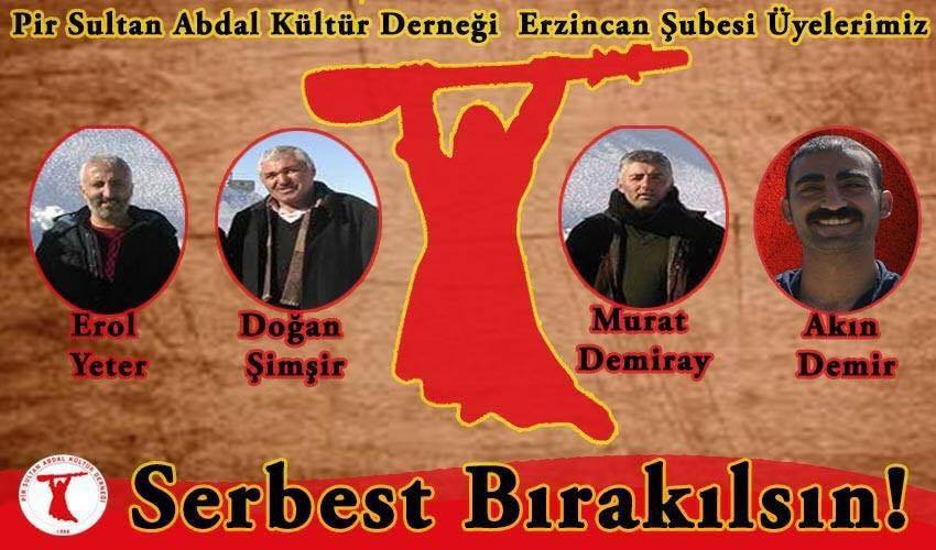 Erzincan’da 16 Mart günü gözaltına alınan Pir Sultan Abdal Kültür Derneği (PSAKD) Erzincan Şube yöneticilerinin de aralarında bulunduğu 16 kişinin tutuklanmasına Alevilerin tepkisi devam ediyor.