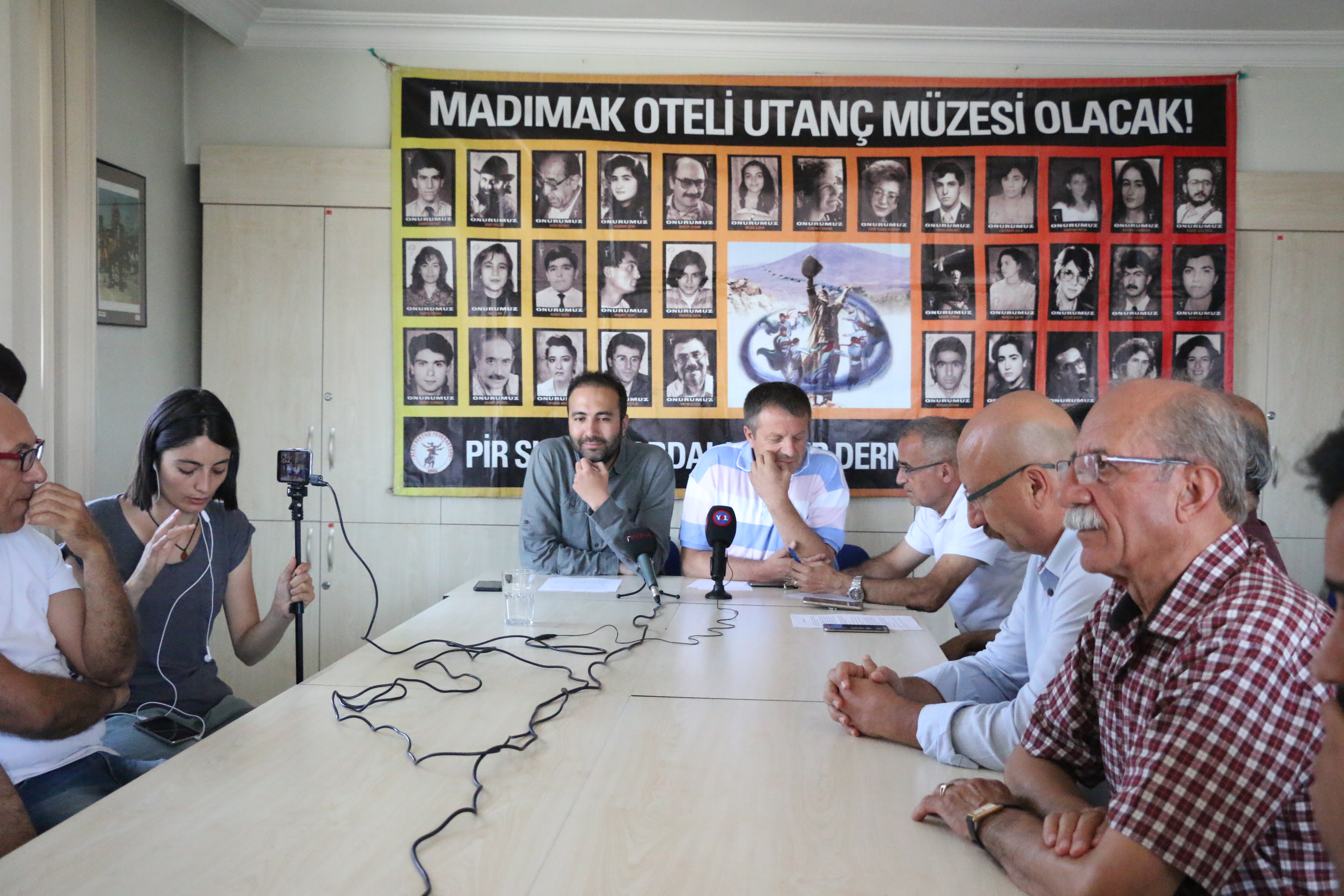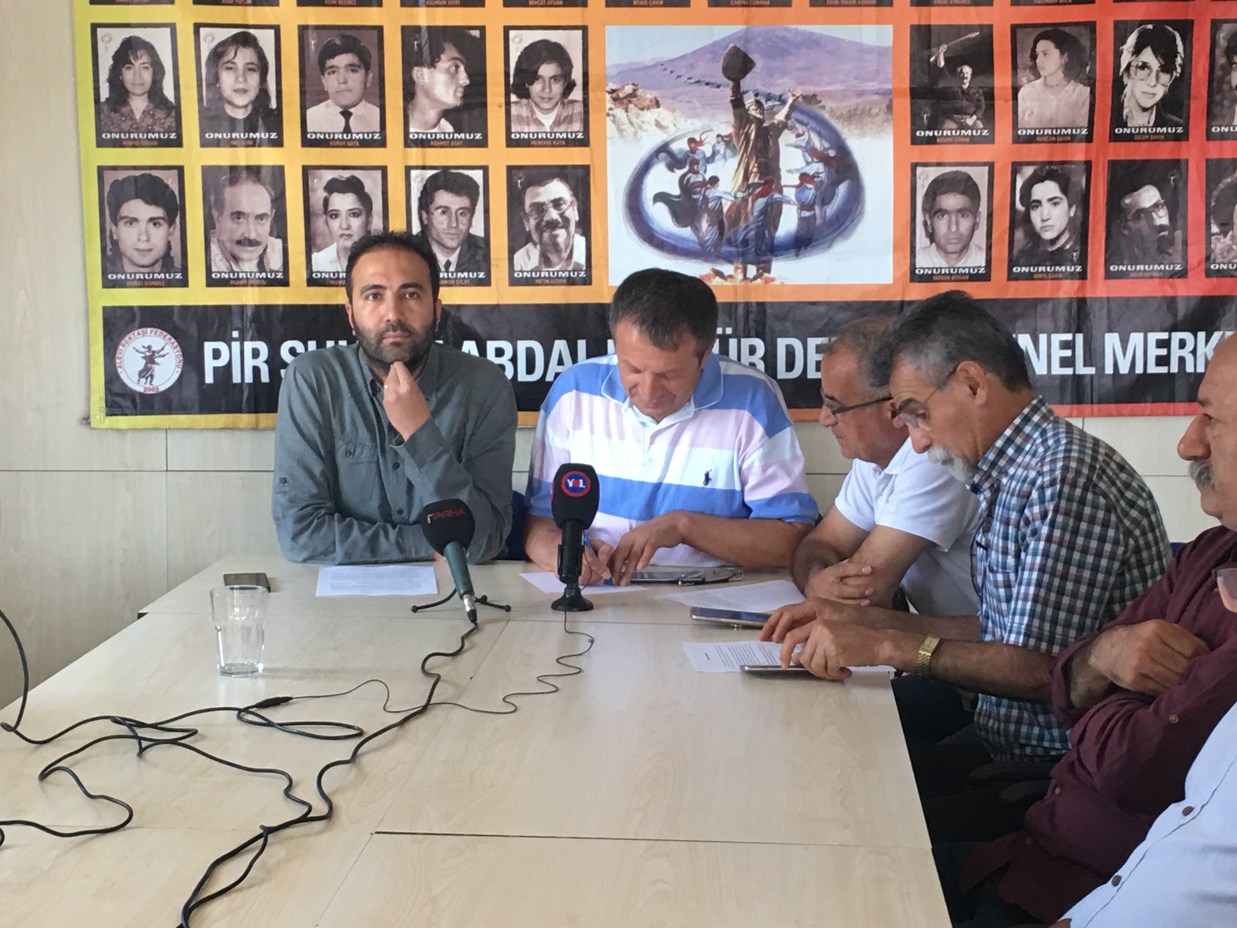 “Hepiniz bildiği gibi 16 martta Erzincan’da bir operasyon gerçekleşti. 11 arkadaşımız önce gözaltına alındı. 23 martta çıkarıldıkları mahkemede tutuklandılar. Genel başkan yardımcımız Erol Yeter ve diğer arkadaşlarımız tutuklandı. Erol Yeter arkadaşımız yaklaşık 3 dönemdir bölgede görev yapan bir arkadaşımızdı. Bölgeyi iyi bilen ve PSAKD örgütlülüğü için önemli bir arkadaşımızdı. Orası zor bir coğrafya. Diğer şubelerle arasında ki mesafe uzak olmasına rağmen şubeler arası görev yapan bir arkadaşımızdı. Gerekçesi ne olursa olsun bu arkadaşımızın bu mahkemede serbest bırakılacağını umuyoruz. Üzerine iddia edilen suç Alevilerin hiçbir zaman kabul etmeyeceği bir suçtur. Yardım ve yataklık üzerinden bir yaklaşımı şiddetle reddederiz. Kim olursa olsun bizim evimize hanemize gelen babamızın katilli de olsa bu evimize girdiği anda bizim misafirimizdir. Dışarı çıkana kadar vali beyle görüşmemizde valiye de bize her şey söyleyebilirsiniz ama yardım ve yataklık yaklaşımı ret ederiz dedik. Bir itirafçının beyanı üzerine arkadaşlarımızı içeride tutuluyorlar. Umut ediyoruz ki 15-16 Ağustosta umut ediyoruz ki yapılacak mahkemede bırakılacaklar. Örgüt olarak orada olacağız, gelebilecek dost, kardeş, musahip kurumlarımızın bütün başkan ve yöneticilerini oraya bekliyoruz.”