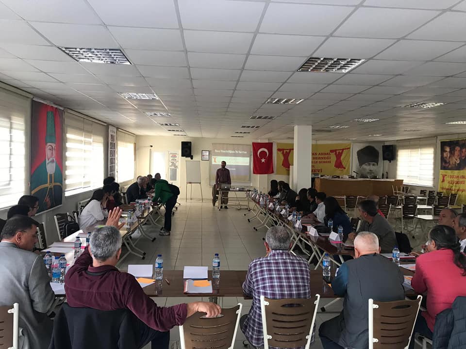 Pir Sultan Abdal Kültür Derneği Genel merkezi tarafından şubelerde, ‘Çalışmaların Koordinasyonu, Örgütlenme Kapasitesini Artırma Ve Hedef Yönetimi Stratejilerini Geliştirme Eğitimi’ başlıklı 2 günlük eğitim çalışması devam ediyor. Çalışma, Yazar Turan Eser’in eğitmenliğinde PSAKD Yenimahalle Şube Batıkent Cemevi’nde başlatıldı.