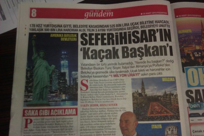 İzmir’de PTT Başmüdürlüğü’nün 25 Mart tarihli talimatıyla, CHP adayı Tunç Soyer’i karalayan 490 bin adet “Ege Yerel Gündem” adlı yerel gazete postane emekçilerine zorla dağıttırıldı.
