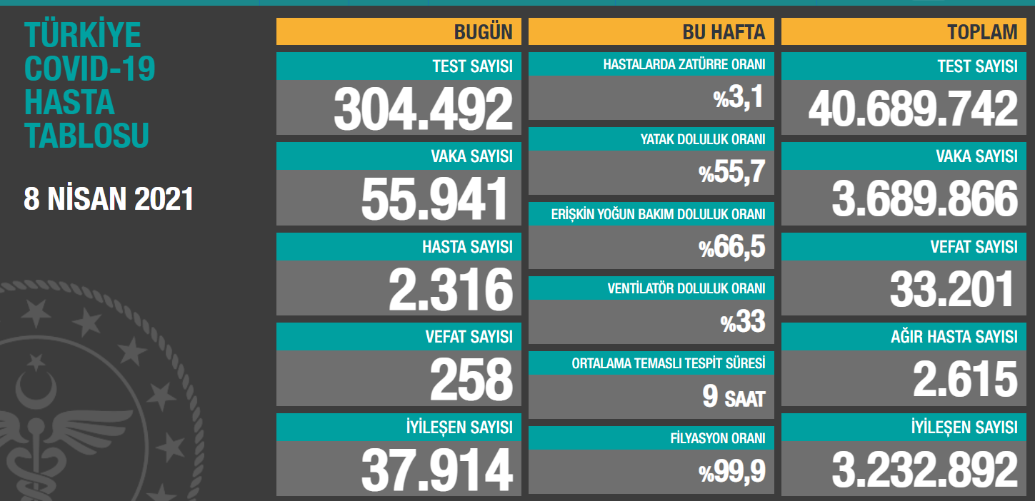 Sağlık Bakanlığı, koronavirüs (Covid-19) günlük hasta tablosunu paylaştı. Verilere göre, Türkiye’de koronavirüs nedeniyle son 24 saatte 258 kişi daha hayatını kaybetti, 55 bin 941 yeni vaka tespit edildi. Hasta sayısı 2 bin 316 olarak açıklanırken, ağır hasta sayısı 2 bin 615 oldu.