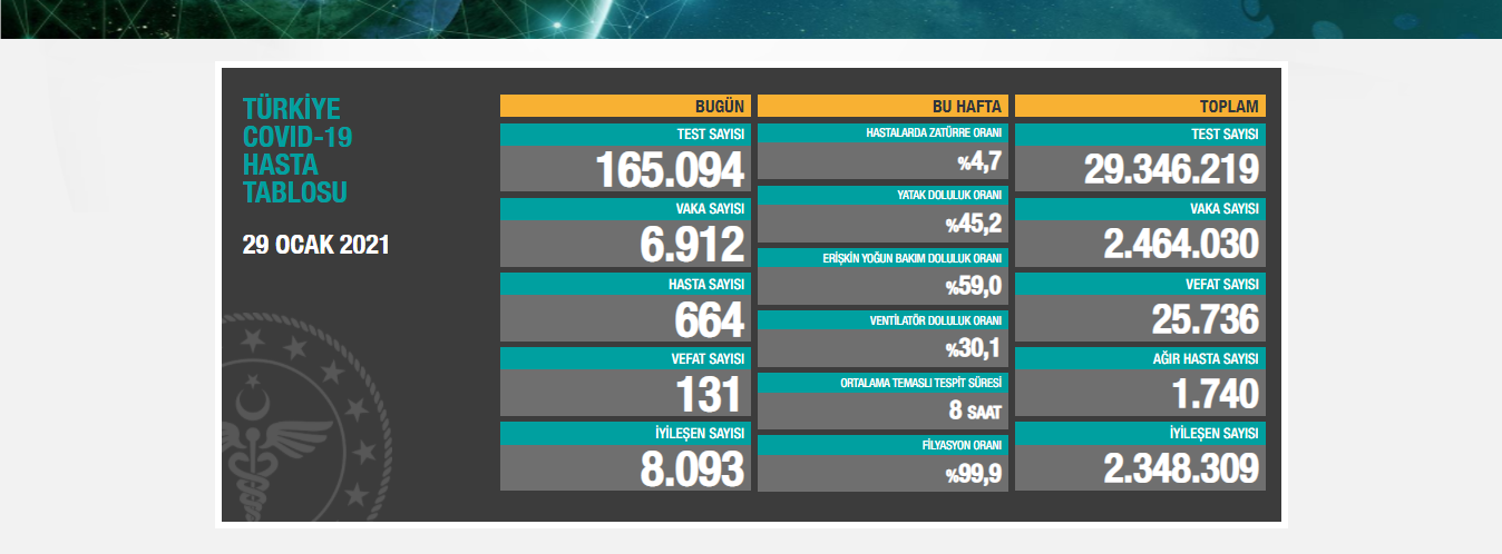 Tabloya göre Türkiye’de Koronavirüs nedeniyle 131 kişi daha hayatını kaybetti, 6 bin 912 yeni vaka tespit edildi. Böylece pandemiden dolayı yaşamını yitiren toplam kişi sayısı 25 bin 736’ya, vaka sayısı ise 2 milyon 464 bin 30’a yükseldi.