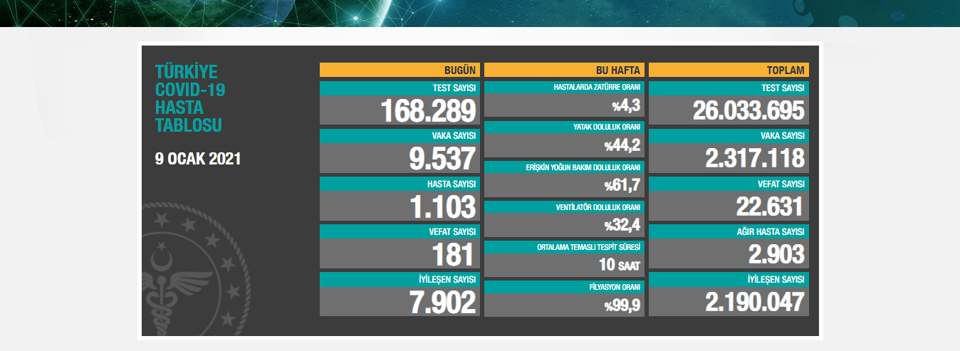 Son 24 saatte 181 kişi yaşamını yitirdi, 9 bin 537 bin yeni ‘vaka’ tespit edildi. Toplam ölüm sayısı 22 bin 631’e, vaka sayısı ise 2 milyon 317 bin 118’e yükseldi.