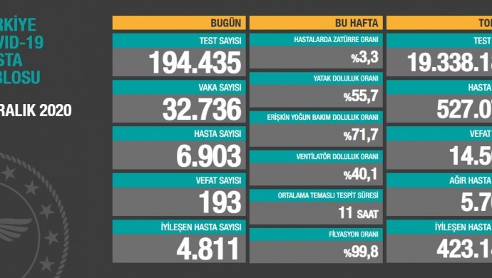 Türkiye’de koronavirüs nedeniyle 193 kişi daha hayatını kaybetti, 32 bin 736 yeni vaka tespit edildi. Böylece toplam vefat sayısı 14 bin 509’a, toplam hasta sayısı ise 527 bin 70’e yükseldi.