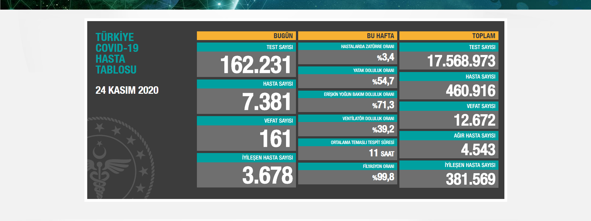 Türkiye’de koronavirüs nedeniyle 161 kişi daha hayatını kaybetti, 7 bin 381 yeni hasta (semptom gösteren ve koronavirüs testi pozitif çıkan kişi) tespit edildi. Böylece toplam vefat sayısı 12 bin 672’e, hasta sayısı ise 460 bin 916’a yükseldi.