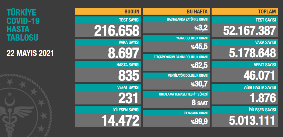 Sağlık Bakanlığı, koronavirüs (Covid-19) günlük hasta tablosunu paylaştı. Verilere göre, Türkiye’de koronavirüs nedeniyle son 24 saatte 231 kişi daha hayatını kaybetti, 835 yeni hasta dahil olmak üzere 8 bin 697 yeni vaka tespit edildi.